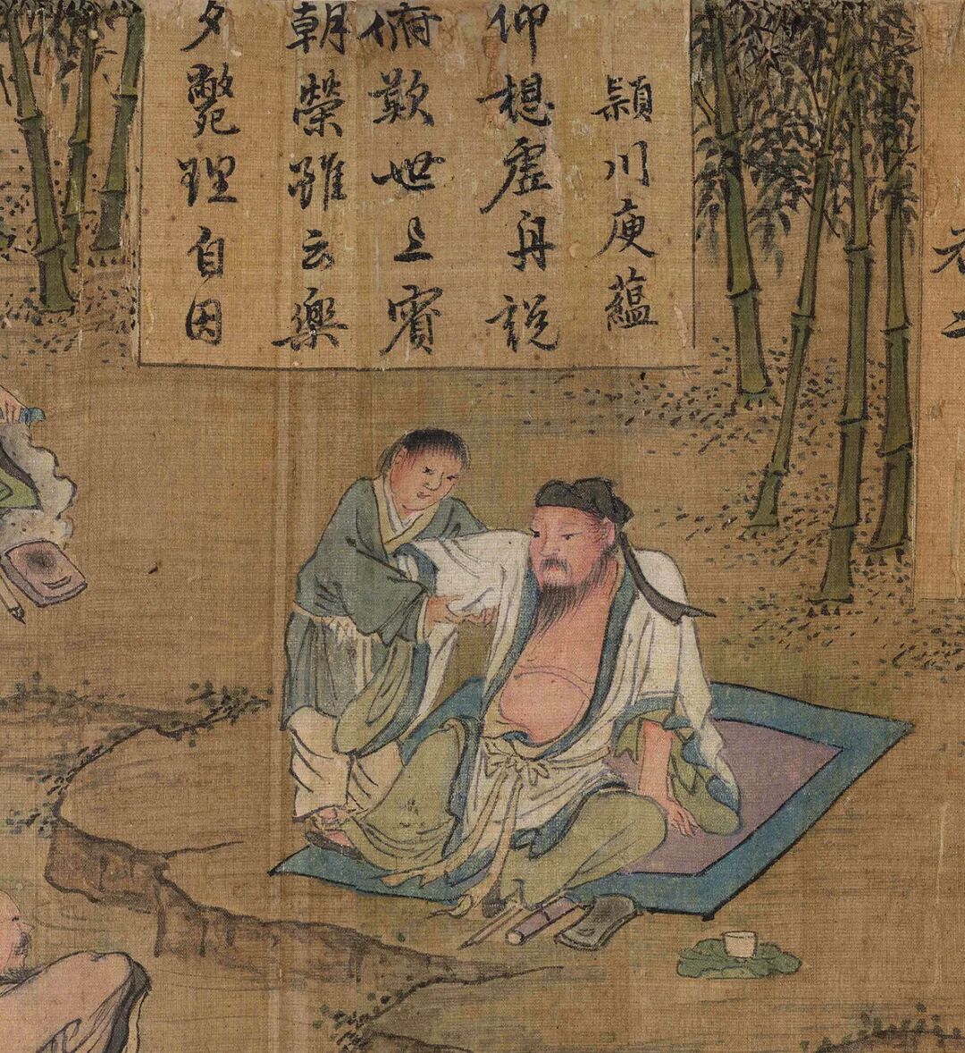 竹边二人,一收卷而卷,一扭头而观诗。竹底一人,安笔砚、整衣冠而坐。