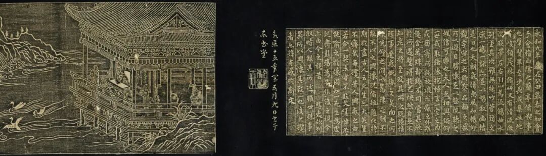 明成祖永乐十五年(1417),周宪王朱有燉(1379-1439)摹刻《兰亭图》,跋语中便称是“仿李伯时之图”,神宗万历二十年(1592)益王朱翊鈏重镌,万历四十五年(1617)益王之子常迁又补刻。乾隆四十五年(1780),乾隆皇帝得到常迁的补刻本,次年命内府作大规模的摹补,命画院供奉贾全(1736-1795)临仿《李公麟流觞图》,全部刻石于当年十月竣工,称为“补刻明代端石兰亭图帖”,是为继乾隆四十四年(1779)命工摹刻《兰亭八柱帖》之后的又一件盛事。