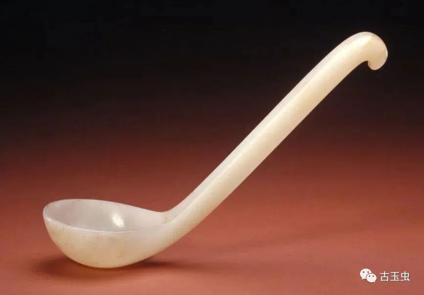 勺白玉质,玉质温润,打磨光滑,略有黄褐沁斑。直柄,柄首勾曲回卷,勺体较深。通体光素无纹饰。