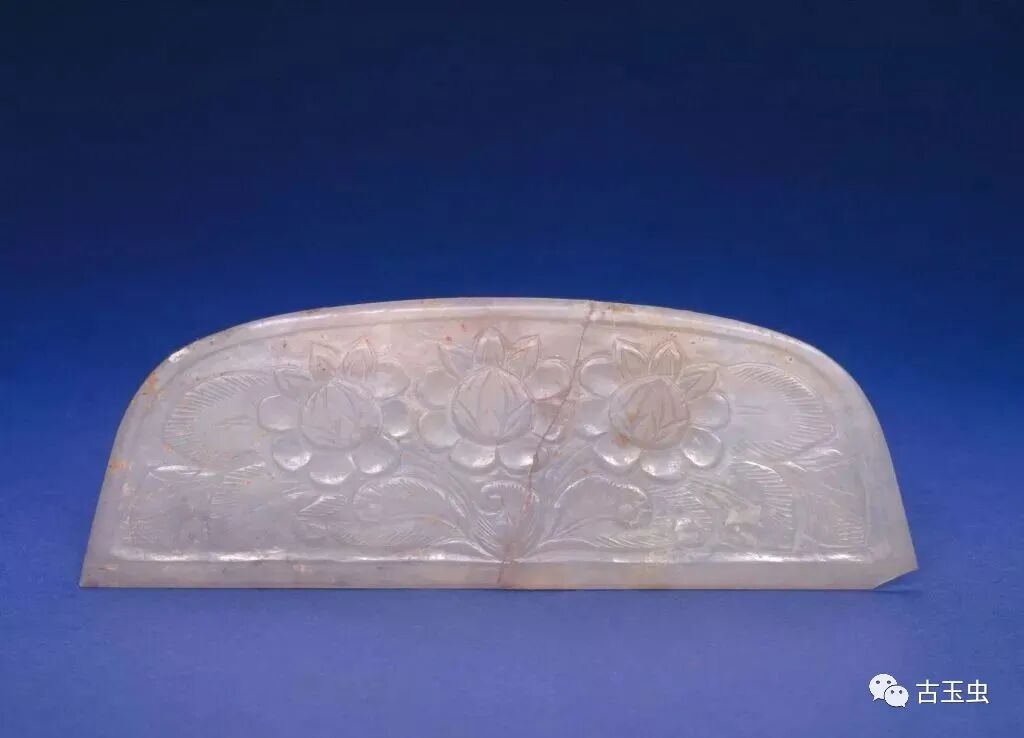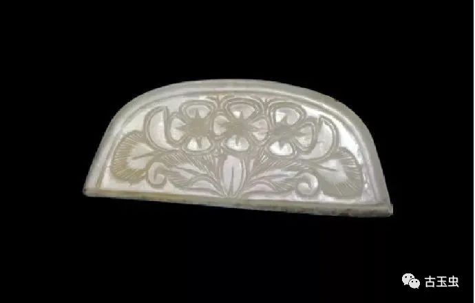 此种梳背是嵌于梳上的装饰。唐代妇女所用梳具十分精致,质地多样,或银,或木,梳上往往嵌有饰件。目前发现的玉梳背多为唐代作品。此件梳背上所饰花叶造型奇异,花心大如苞蕾,花朵下的侧形叶端部回卷,是受中亚造型艺术影响的表现。