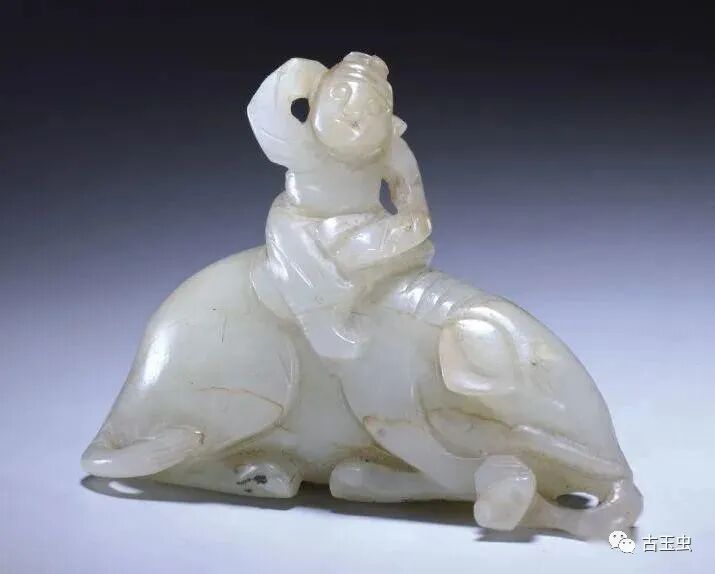 青玉有绺裂、絮斑。圆雕一男子侧身坐于象背之上。象卧伏,神态温顺。人物头戴软帽,微后仰。着长袖衫。右腿搭于左腿之上,右手举起放于脑后,左手置于腿上,长袖下垂,作舞蹈之姿。