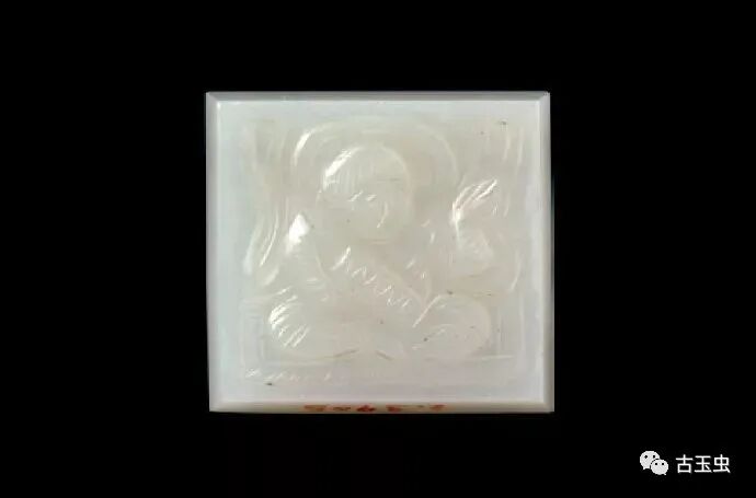 带板为白玉制,近似正方形,略厚,四边呈坡状。中部琢一胡人坐于毯上,项下缀饰物,左手扶膝,右手举杯,一长帛在脑后飘舞,两端从腋下穿过。带板背面无花纹,四角各有一对穿孔,并有阴镌“十一六”3字。