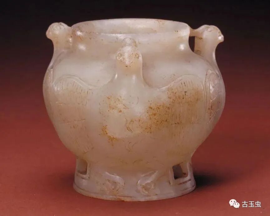 罐由白玉制成,圆口,鼓腹,圈足,足壁镂雕3个方形孔。器表等距饰有3天鸡,作展翅直立状,圆雕头部,翅膀与爪浮雕于器身,以阴线刻出羽毛纹理,线条简洁流畅。