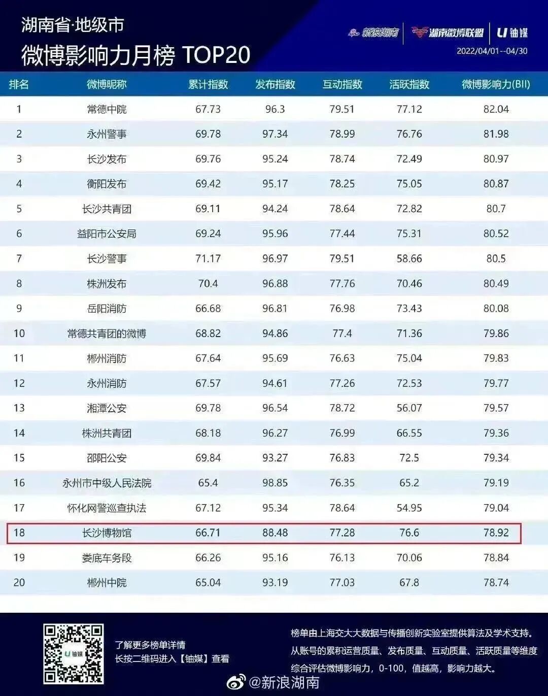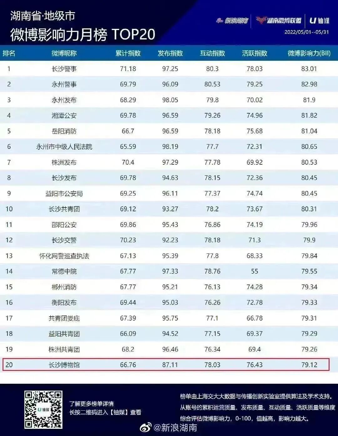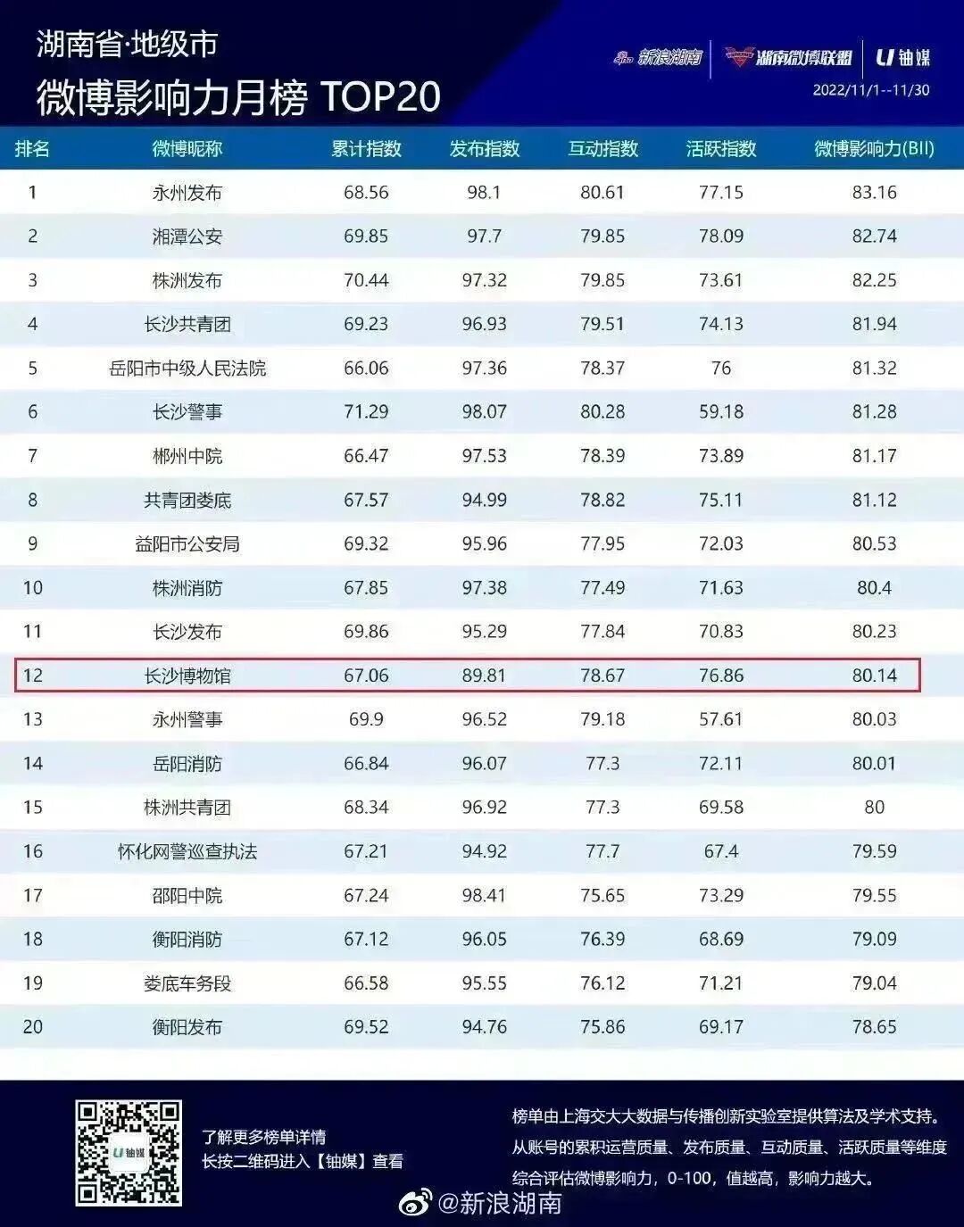 还先后9次登上湖南省微博影响力月榜TOP20榜单及荣获2022年度创新应用与传播优秀微博。