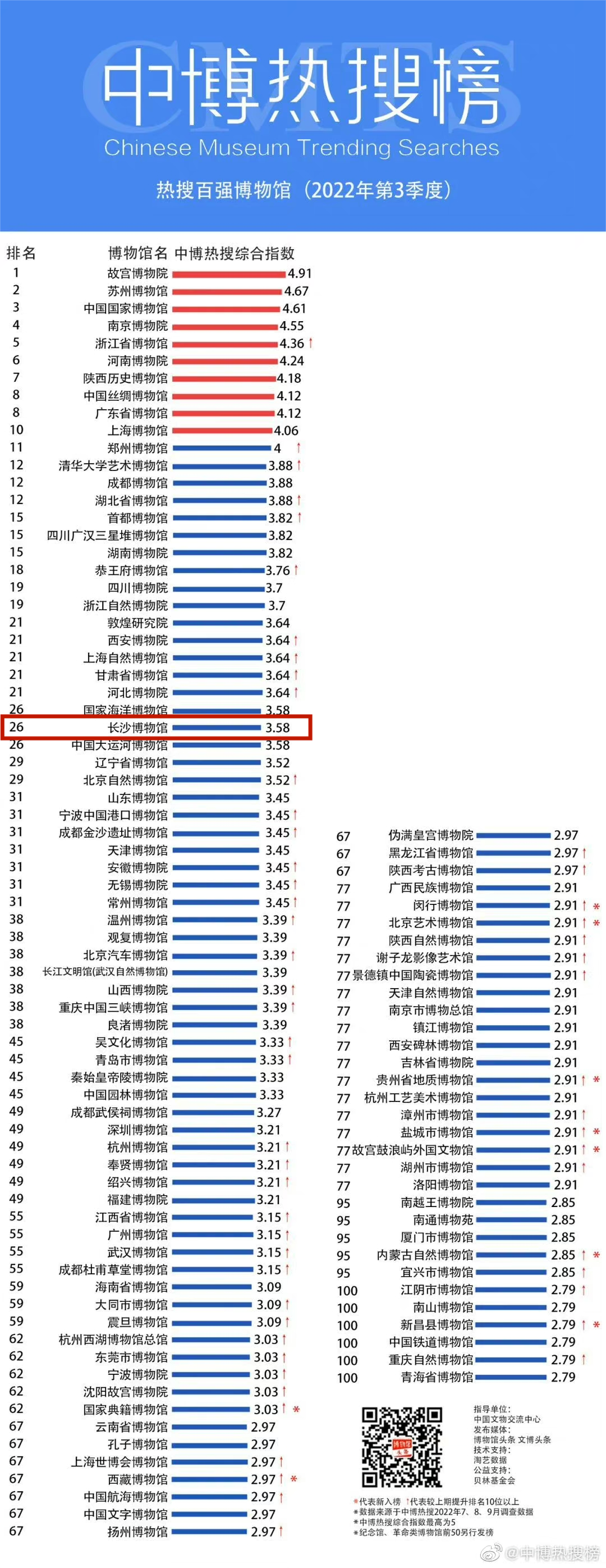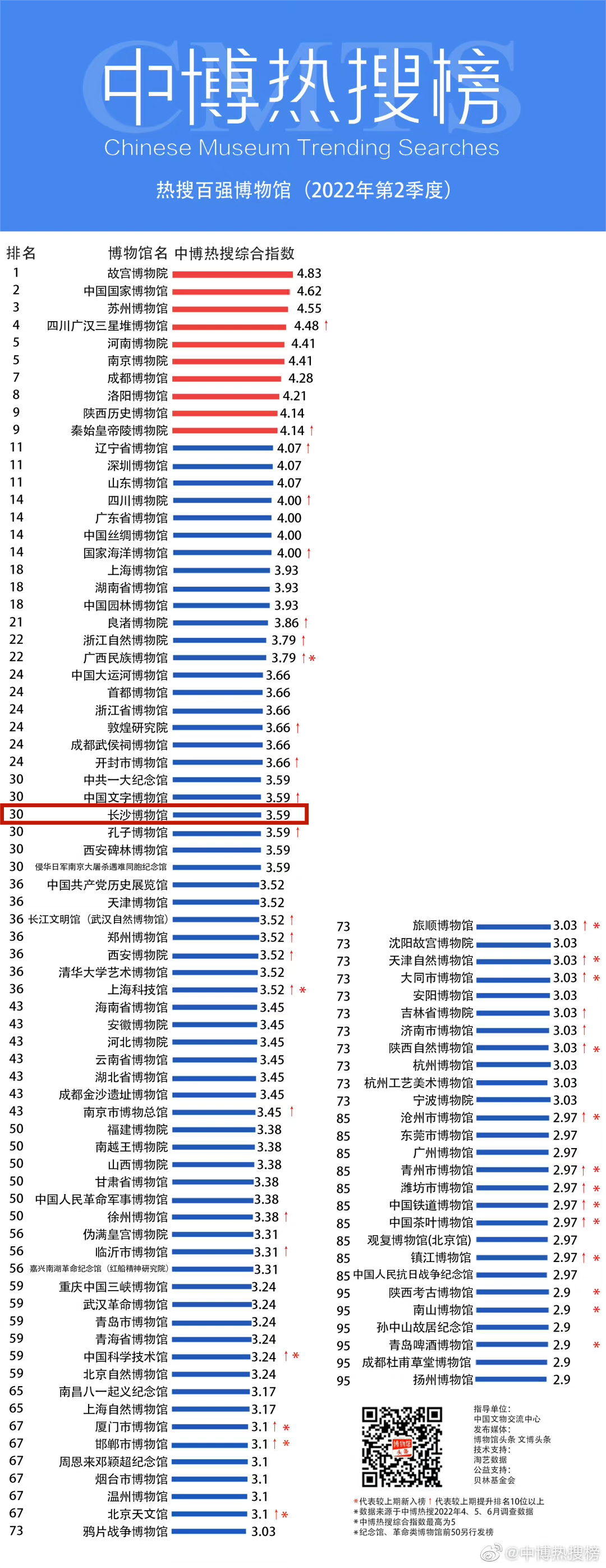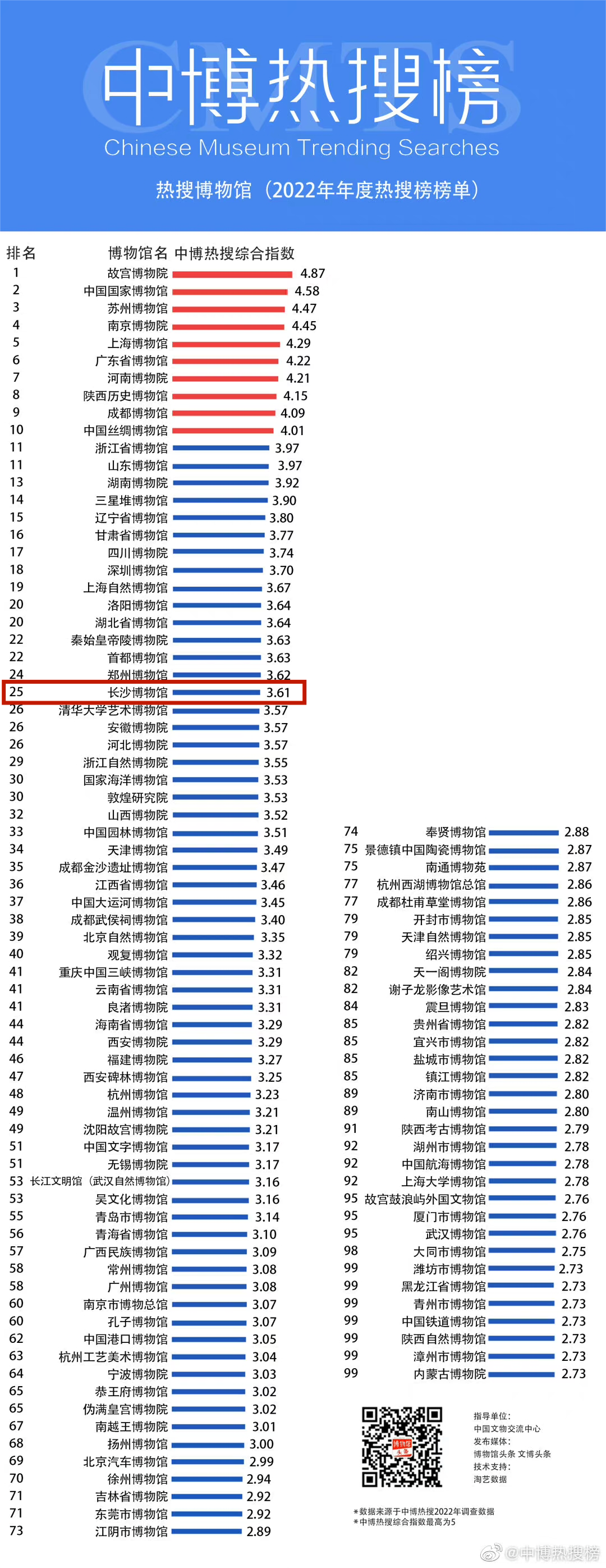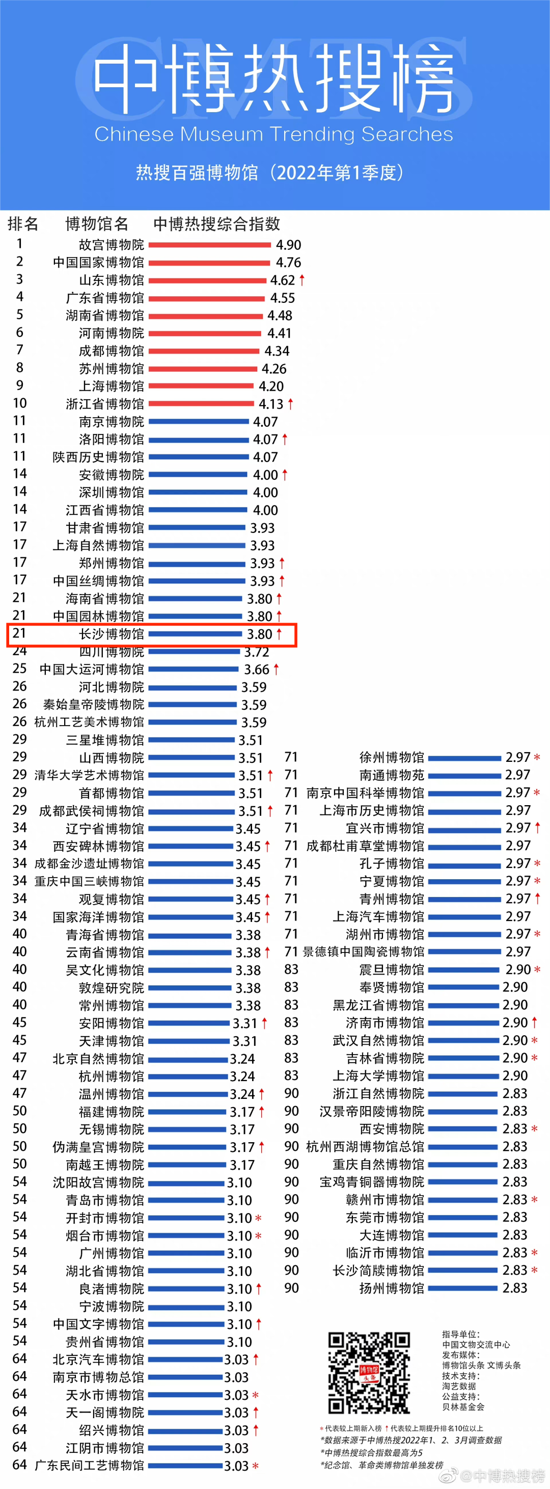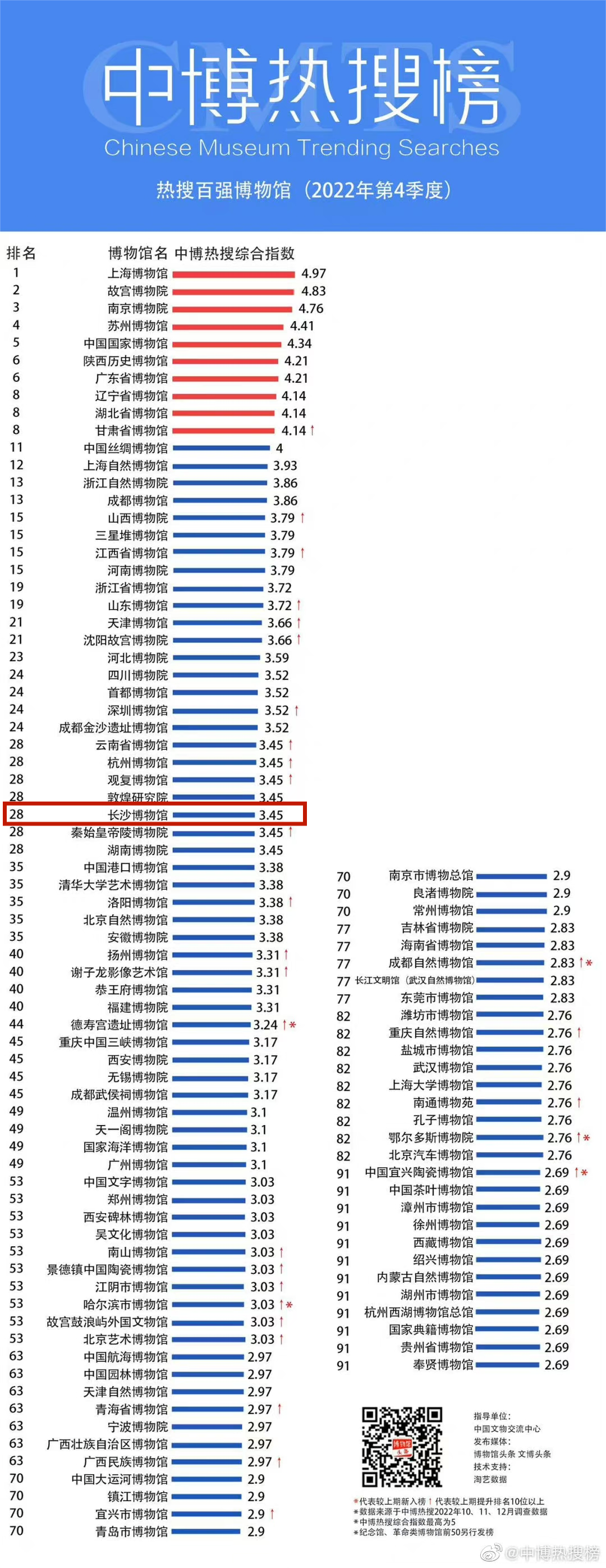 与此同时,长沙博物馆在2022年的一至四季度稳居全国博物馆“中博热搜榜-热搜百强榜”。