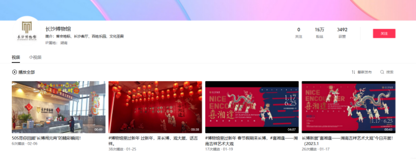 2022年长沙博物馆抖音平台新增5万名粉丝,截止到目前累计粉丝量15.1万,累积收获750万人次播放量。