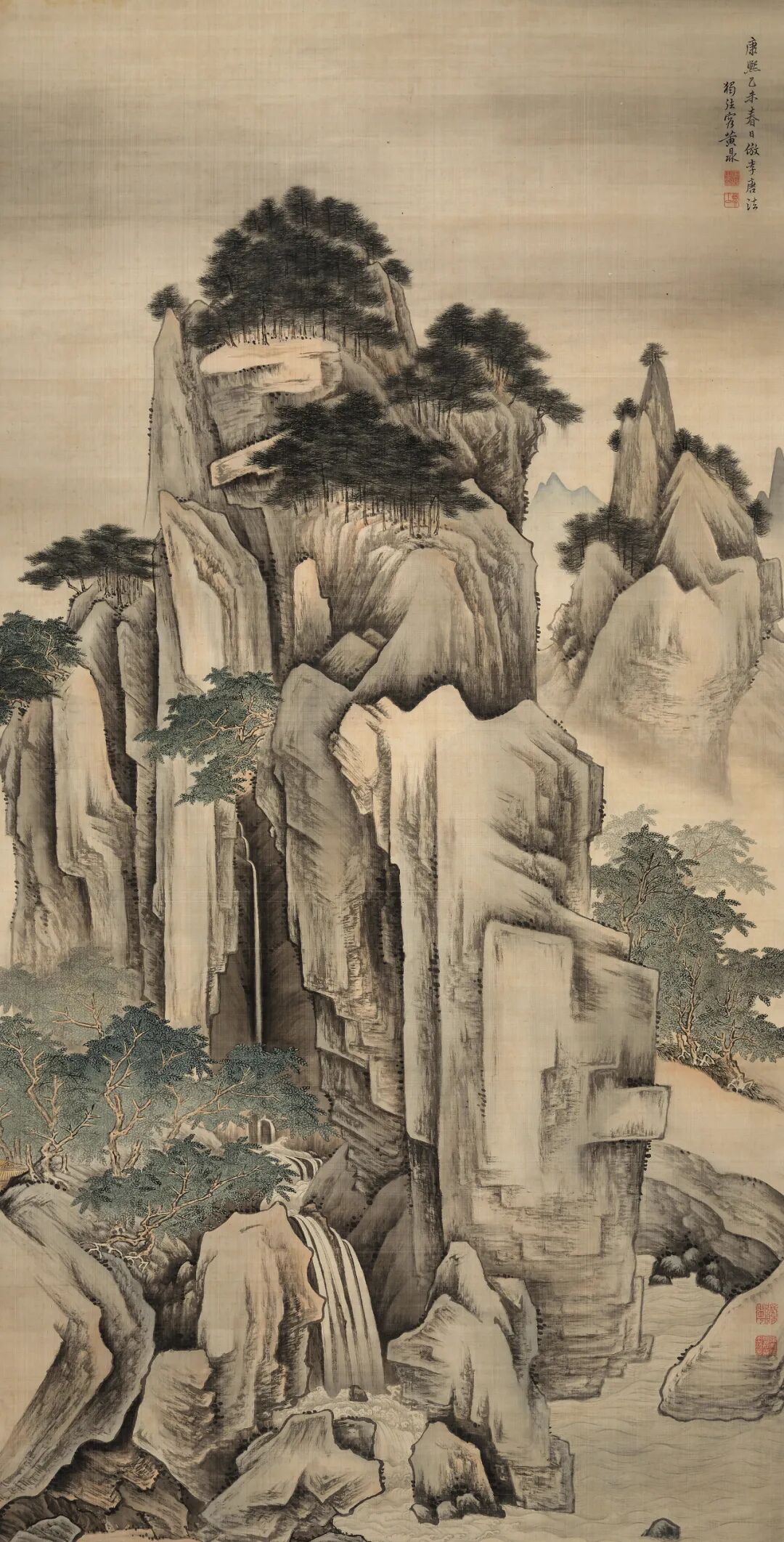 此帧《仿董巨苑山水》以高远构图,是画家心目中的理想仙境。绘高山屹立之下,重峦叠嶂,流泉飞瀑,杂木丛生、洲渚 房屋掩映的山光水色之景,于雄奇中内具空灵之貌。山石的顶端多留有空白,干笔皴擦,淡墨晕染,山顶重墨点苔。密集 的簇点,且加入墨线来加强山的体势,线、点、皱的融合更为强烈。虚处笔迹似有似无,表现出岚光浮动的清幽意境。整幅作品具有淡而厚、实而清的书卷之气笔墨苍润老辣,于粗放中物象毕现,率意中气韵盎然。画作饱满的构图、雄浑的气势、深幽的意境以及山石的皴法都源于董巨,而生拙的用笔和多层皴染的画法则流露出作者“熟不甜,生不涩,淡而厚,实而清”的自家面貌,得山峦于风骨奇峭中包孕秀爽清润之美。王原祁在提倡“仿古”的同时,还强调摆脱古法的羁绊,成自家风格,在“仿古中求脱古”。他曾说:“画道与文章相通,仿古中又须脱古,方见一家笔墨,画虽小苑,所以可观也。”此轴便是其“仿古脱古”的典型代表作。