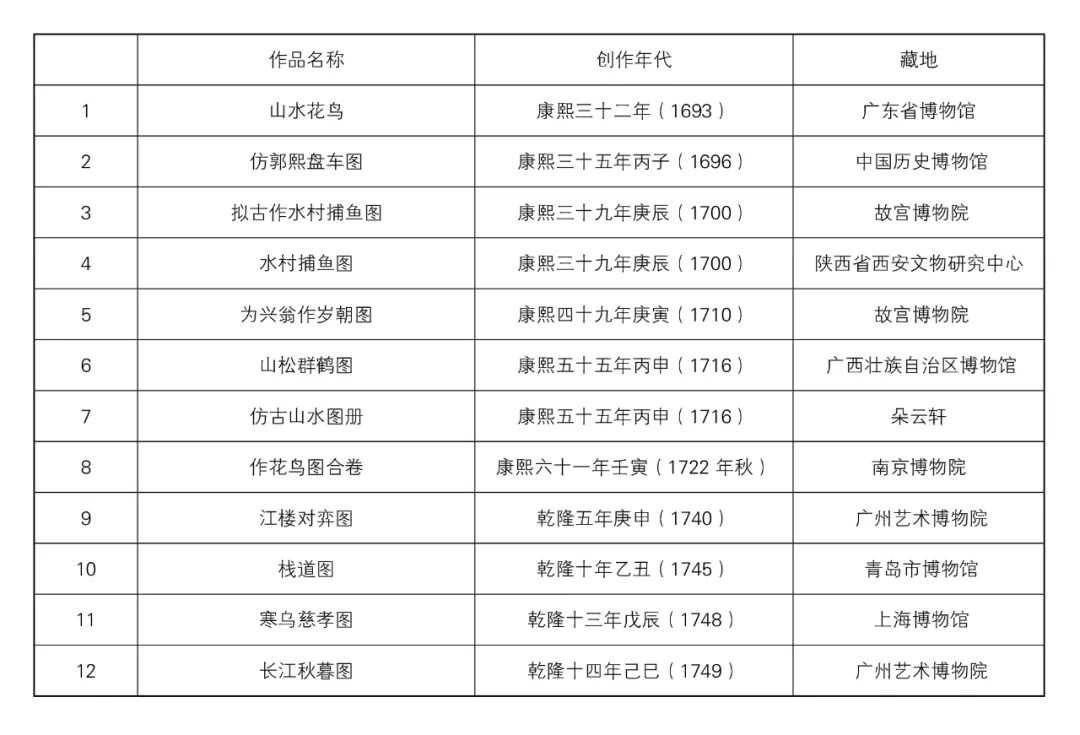 颜峄作画严谨,绘画作品存世不多,但件件皆精。公藏颜峄有明确创作纪年作品不足二十件,例举如下表。以上表可视,颜峄作于康熙、乾隆两朝绘画较多,作于雍正朝作品非常之少。