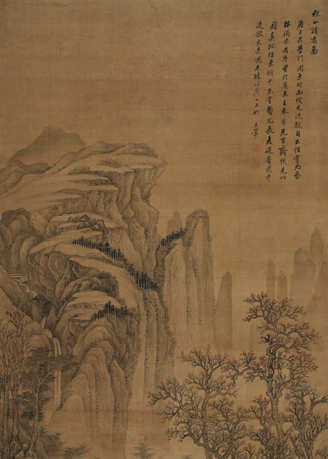 “四王”一脉承接董其昌绘画思想,所谓“南宗正脉”,故以画中董源(北苑)、巨然为宗,以“元四家”为续,绵延至今。王原祁在其离世的前一年1714年所画山水题曰:“余从大痴(黄公望)入门,渐有进步。欲竟其学,公余辄究心董、巨,此得本莫愁末之意也”。终其艺术创作始终,董源始终是其创作之灵魂所在。本作书款“麓台老人”,亦极为少见,常见其款书“王原祁”或“麓台祁”者多矣。虽为晚年,画面仍真力弥漫,一丝不苟,笔法较中年之“金刚杵”、设色之“熨斗法”都复归平淡天真,自然之致,或可称为“豪华落尽见真淳”。