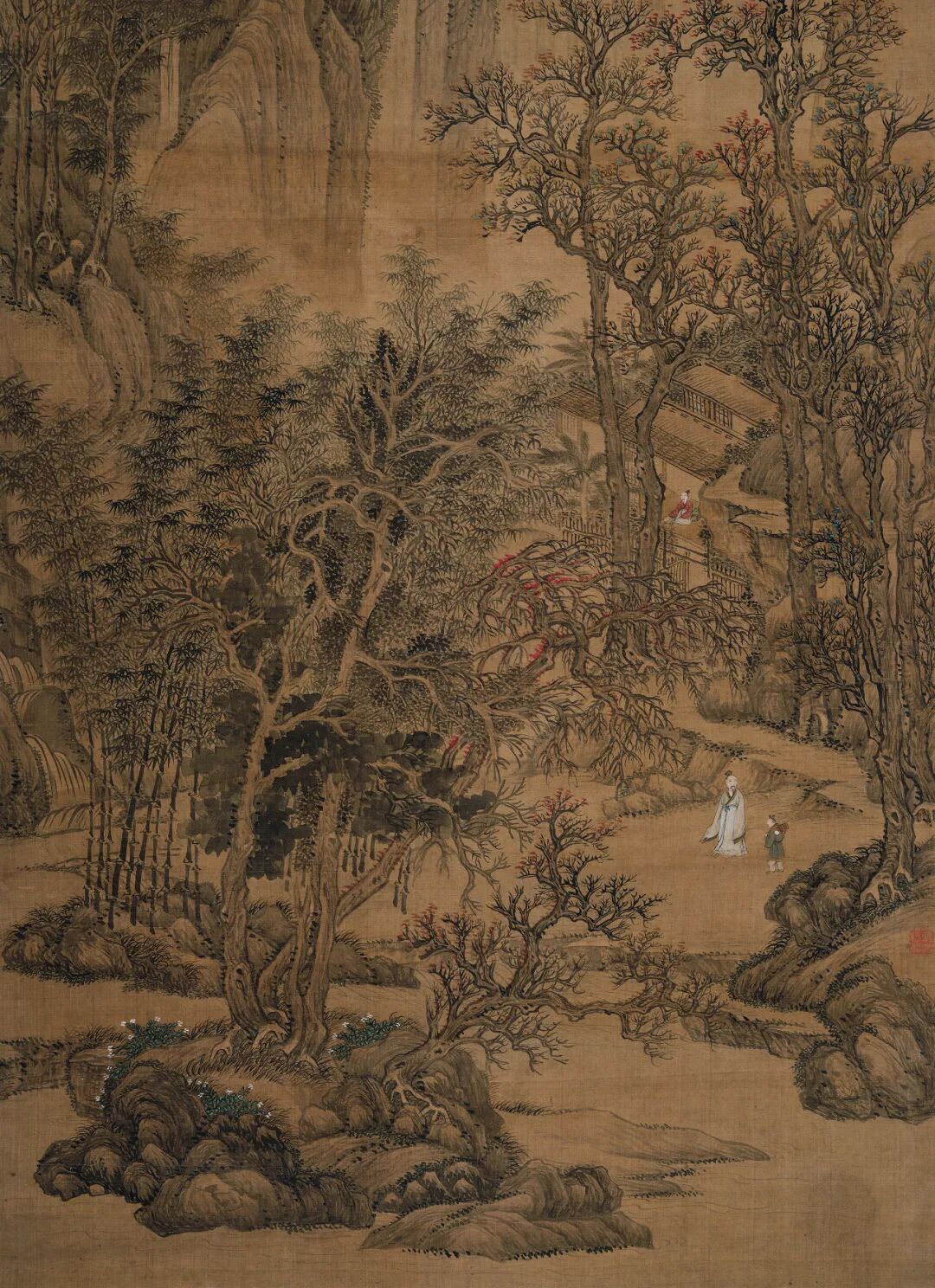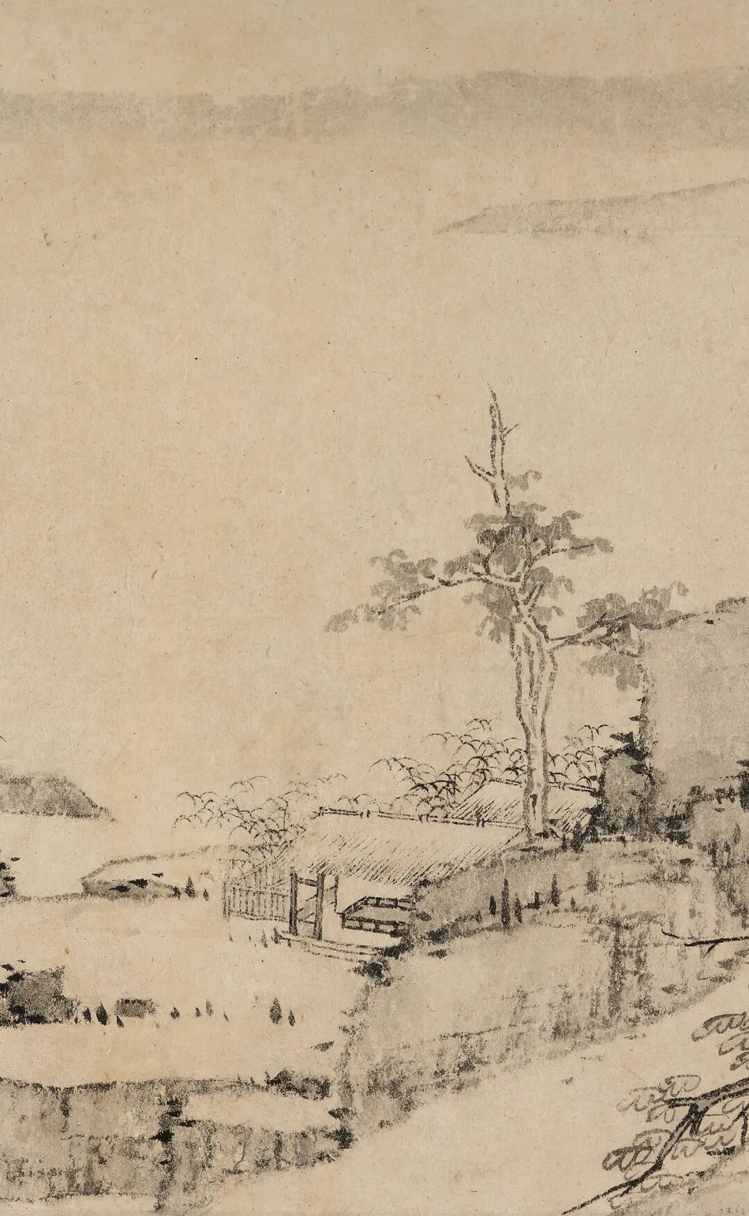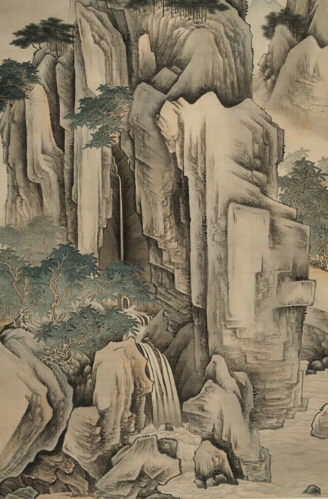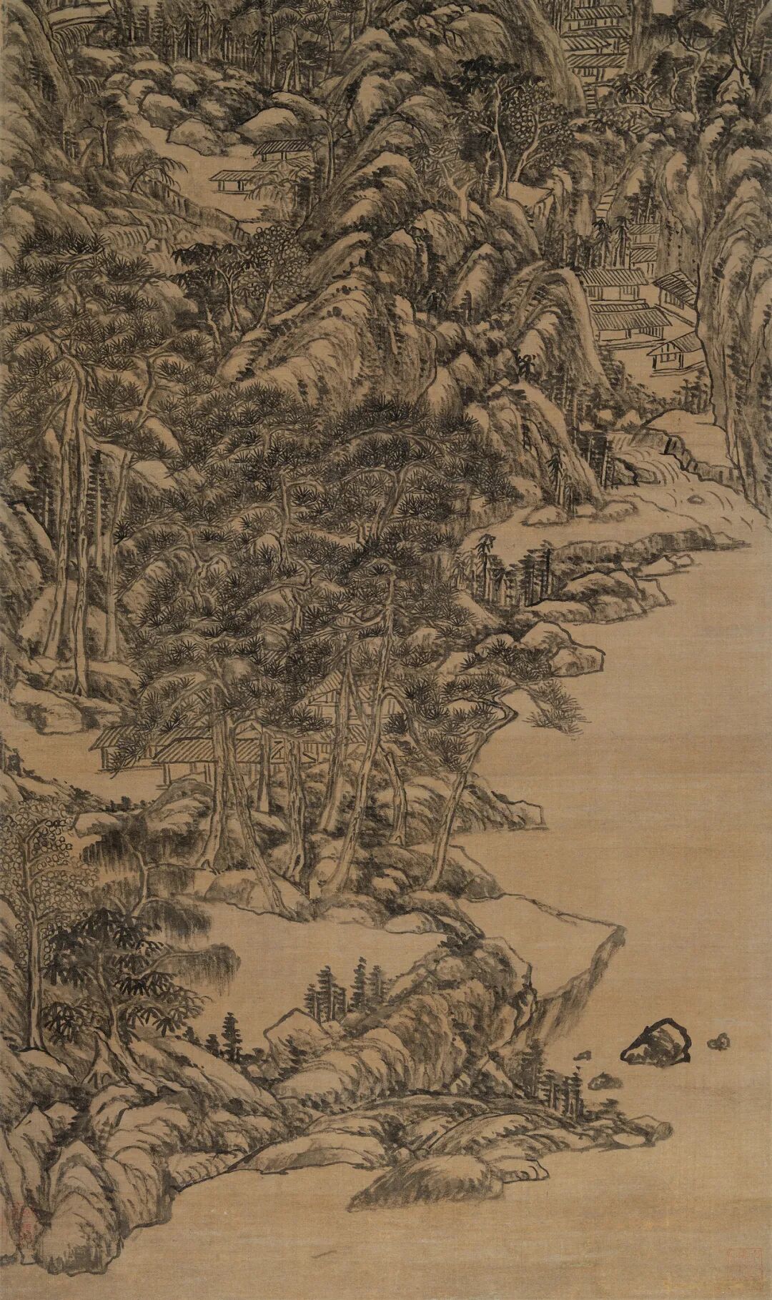 观此卷气象,以平远式构图表现,岩壑奇秀,奇松点缀其中,沿江景物,用笔瘦硬,皴染枯淡而墨韵清润。以刚劲凝练的笔线勾勒,折带皴、披麻皴交互为用,山峰之间,礁石垒叠,疏疏密密、大大小小,形成参差错落的“矾块”,山峰中的涧溪,曲折逶迤而下,形如盘龙出水,跳荡击石,泠然有声。清人杨翰曾评论其突出的风格:“于极瘦削处见腴润,极细弱处见苍劲,虽淡无可淡,而饶有余韵。”当时本幅之写照。