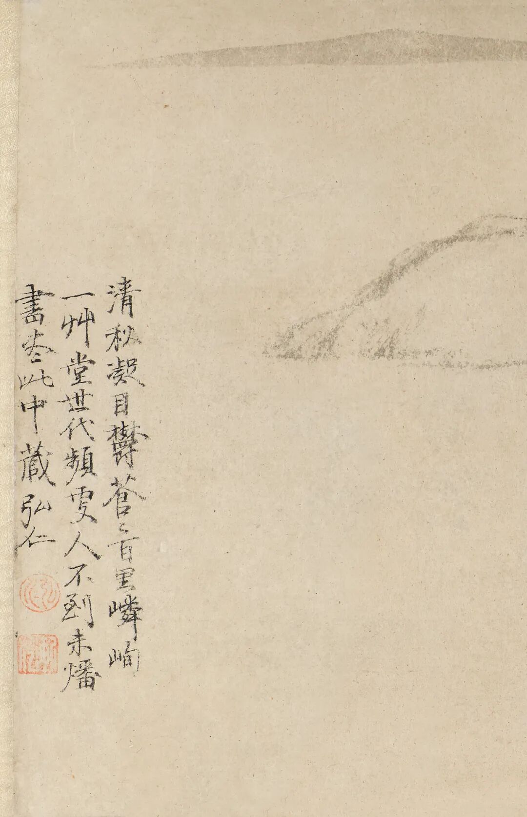 此卷诗题:“清秋凝目郁苍苍,百里嶙峋一草堂。世代频更人不到,未燔书尽此中藏。”经多次著录,根据《中国画史馨香录》书中所记,此题画诗原出自郑旼康熙戊申(1668年)录“渐公题诗二十三首”手钞本,1934年,许承尧录寄黄宾虹。卷后有弘仁好友程守题跋更证其清晰传承。程守,字非二,号蚀庵,与弘仁同乡,少九岁,二人少年时即结交,弘仁入闽时,曾“哭别相公潭上”,弘仁去世后作有碑文,并料理其身后事。