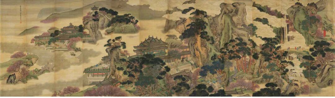 颜峄绘画风格可归纳为古朴秀逸。取意高古,虽写界画不板滞,如本作《仙山楼阁通景》,尽管写神仙故事,更多的是文人逸兴,雅集聚会之亭台楼阁,其间的挺拔苍劲古松、怪石嶙峋、潺潺流水,道家逸士高谈阔论。画面山水布局合规中矩,人物流连其中移形换景恰如其分,貌似穿越时空又在人间仙境。营造法式的楼台亭阁适当尺度让颜峄此作充满生机。其中,画中经常出现大面积没有绿植的石山,石坡却聚集了众多仙人高士,奇峰怪石,采用各种皴法表现画面的气势。既有道家的“无为”也有佛家的“心意”。看似矛盾对立实际在画面关系中却是可以整合成为天人合一的哲学。