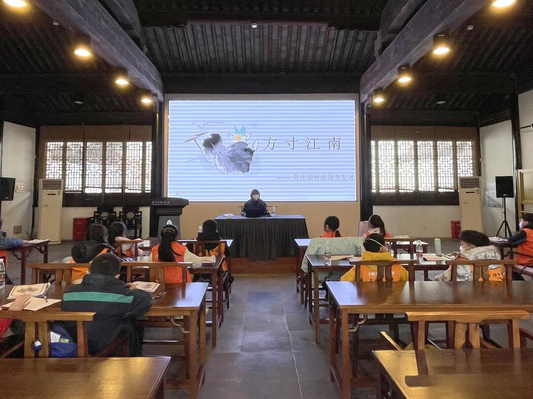首先是一场关于苏州园林的理论导学课“方寸江南”,带队老师给大家讲述了苏州园林的发展脉络,从狩猎的囿到帝王宫苑再到江南文人写意园,静心感悟这苏州园林历经多少历史更迭的滋润与沉淀,才能有得如此深邃的文化底蕴和至高的美学造诣。