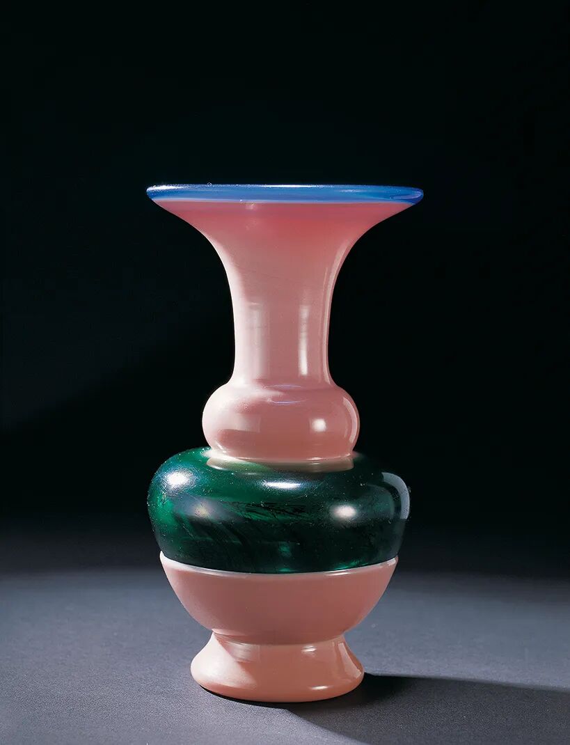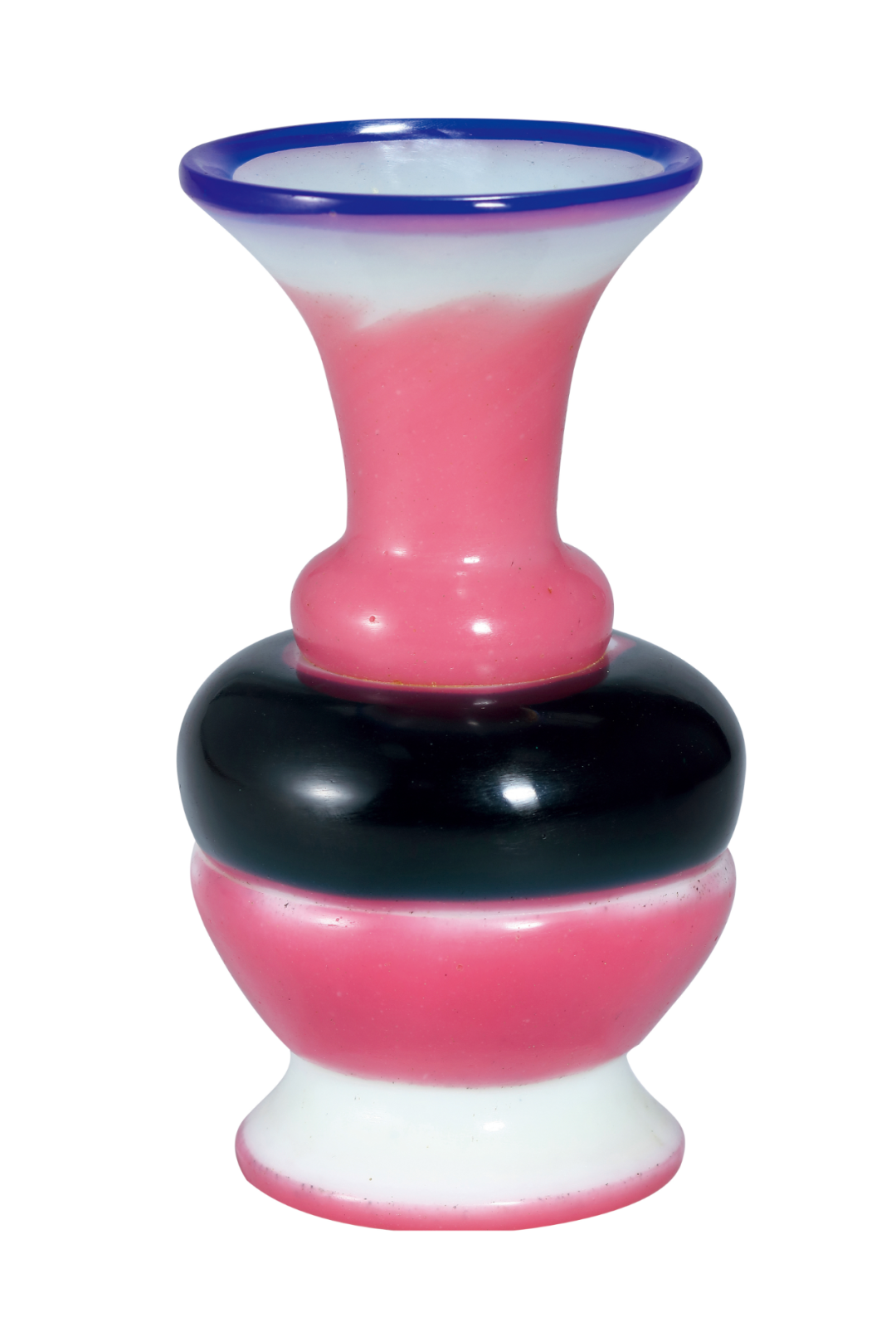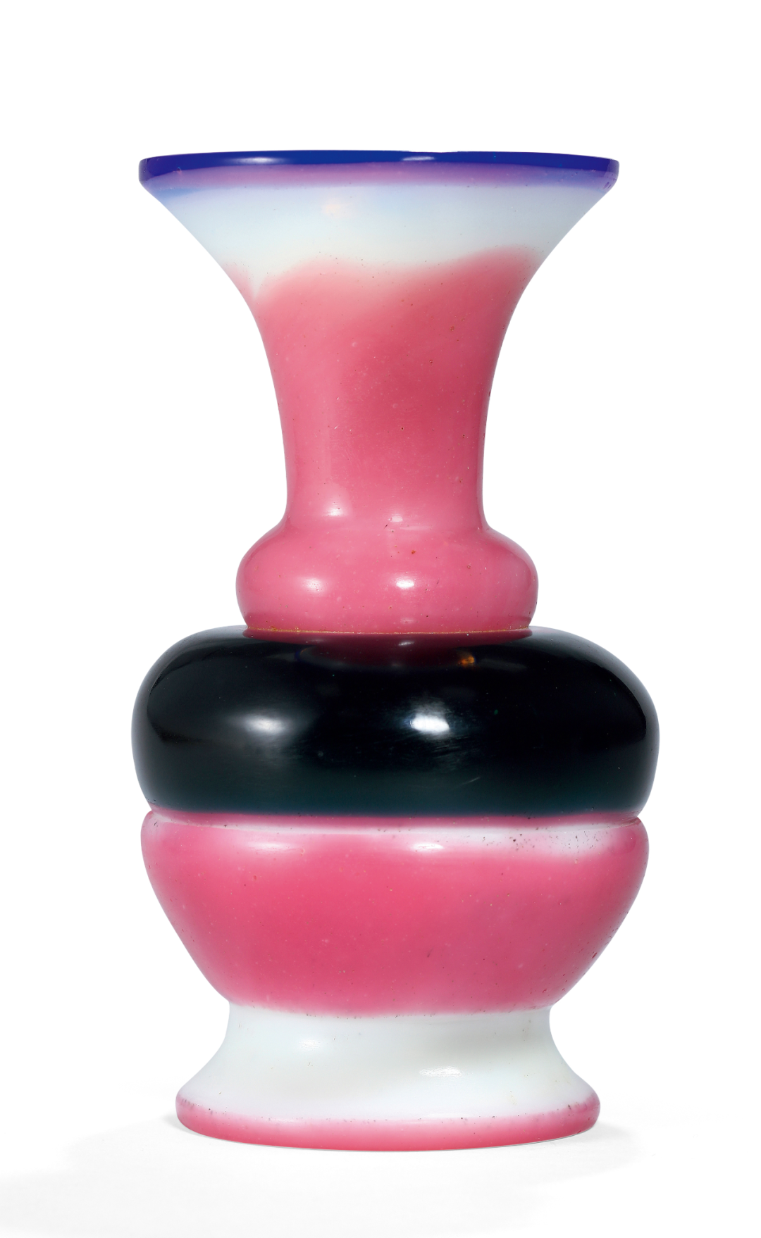 此瓶造型规整,玻璃质地纯净,磨制技法娴熟,其造型、款识均与故宫所藏乾隆朝宫廷造办处所制标准玻璃器皿相同。加之主体采用少见的粉色玻璃,且颜色纯正娇艳欲滴,因此更显珍贵。这种多色料瓶制作难度极大,在宫廷料器中大大少于单色料瓶和套料瓶。北京故宫造办处制多色料瓶仅有两件,其中一件造型、尺寸与本拍品一致,颜色为蓝、绿、红三色。此件造办处制多色料瓶在拍卖市场尚属首见。