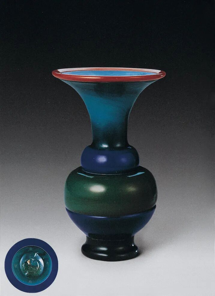 此瓶用吹、套、模制三种技法制成,喇叭口,长颈,凸肩,圆腹,高圈足。口内外及圈足为涅白料,颈部、肩部和下腹部均为藕粉色,口沿处套一圈浅蓝色玻璃料,上腹部为墨绿色。瓶底为藕粉色,内凹,于底足四周环刻“乾隆年制”楷书款,字体朴拙,刀法爽利,非后可模仿,作上下右左顺序排列。