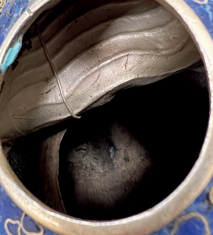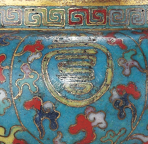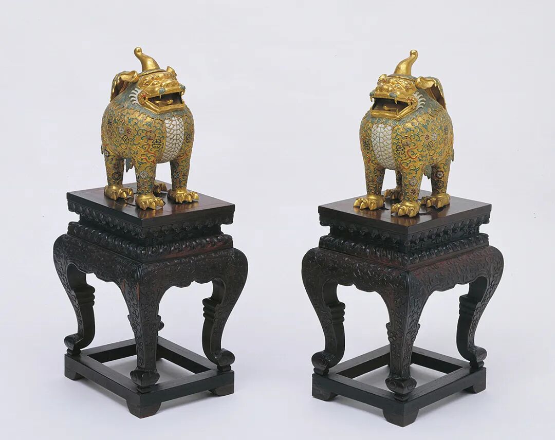 原配珐琅底座,装饰各色掐丝花纹,诸色交辉,层次宛然。此器将掐丝珐琅工艺与錾胎珐琅工艺完美结合,造型生动,鎏金璨然,釉色搭配和谐,为清初珐琅器之代表佳作,承继明代珐琅制器。