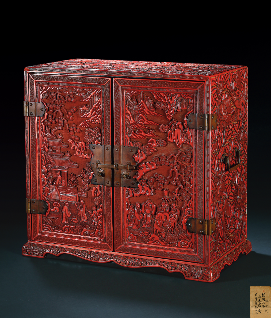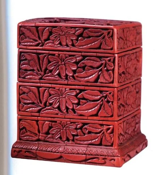 箱为立式,正面对开门似小柜,箱内分三层六屉,屉面雕荔枝、菊花、牡丹等各式花卉纹,边框以回纹装饰。箱之两侧面亦剔红满雕牡丹绶带鸟图,正中铜嵌把手,便于提携。箱门与箱身以合页相连。箱门上剔红人物楼阁图景,以万字锦纹为边饰,菱格纹分别表示天和空和地面。画面上松树、人物、楼阁、山石皆布局合理,层次分明,寓意美好。箱顶部与背面,亦剔红满饰花卉绶带鸟图,与两侧面相呼应;底座为壸门式,雕饰缠枝花叶,整器线条流畅,雕工精湛。