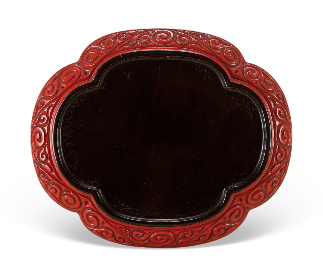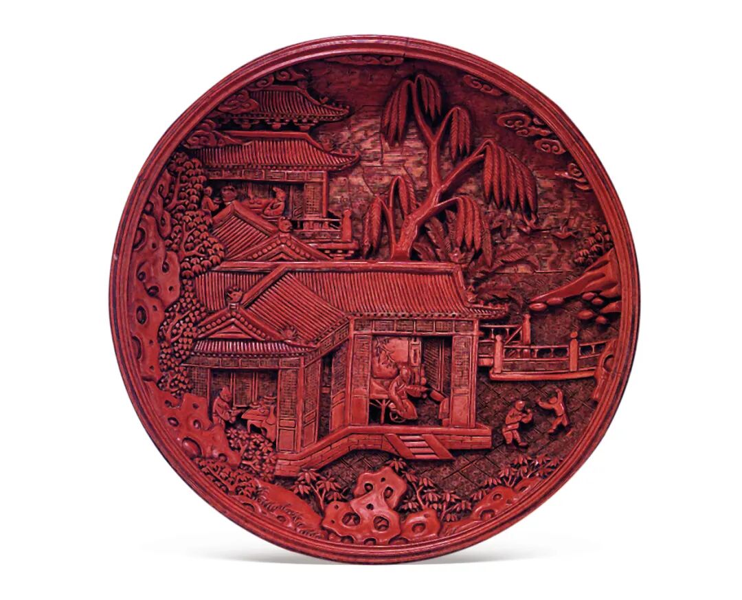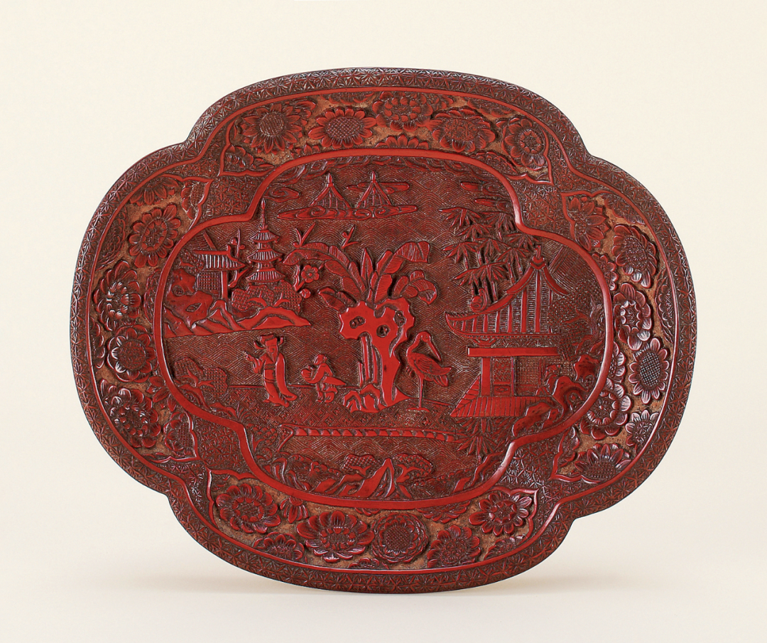 此盘通体髹朱漆,剔漆而制,呈海棠形,口沿微敛,沿口处起棱边,浅弧腹,圈足。盘心雕饰以远山、烟林为景,一主一仆行走其间。前方山林延绵,正中一棵苍松扎根于嶙峋怪石上,树干挺拔,枝叶繁茂,巧妙填补了盘心的空白。此盘漆层厚实,漆色深沉,盘底髹黑漆,上有断纹,平添斑驳古旧之感。剔红,元时有张成、杨茂为此法名手。明朝建立以后,由于皇室的喜爱及对外赏赐的需要,剔红漆器得到了较快发展,明代的宫廷剔红作品,继承了元代器物造型端庄、用漆精良等特点,并在精细程度上有过之而无不及。