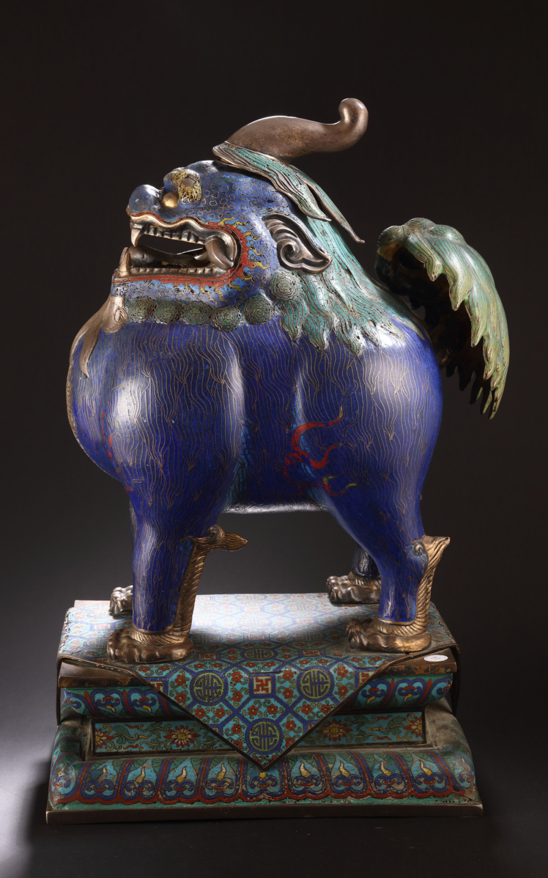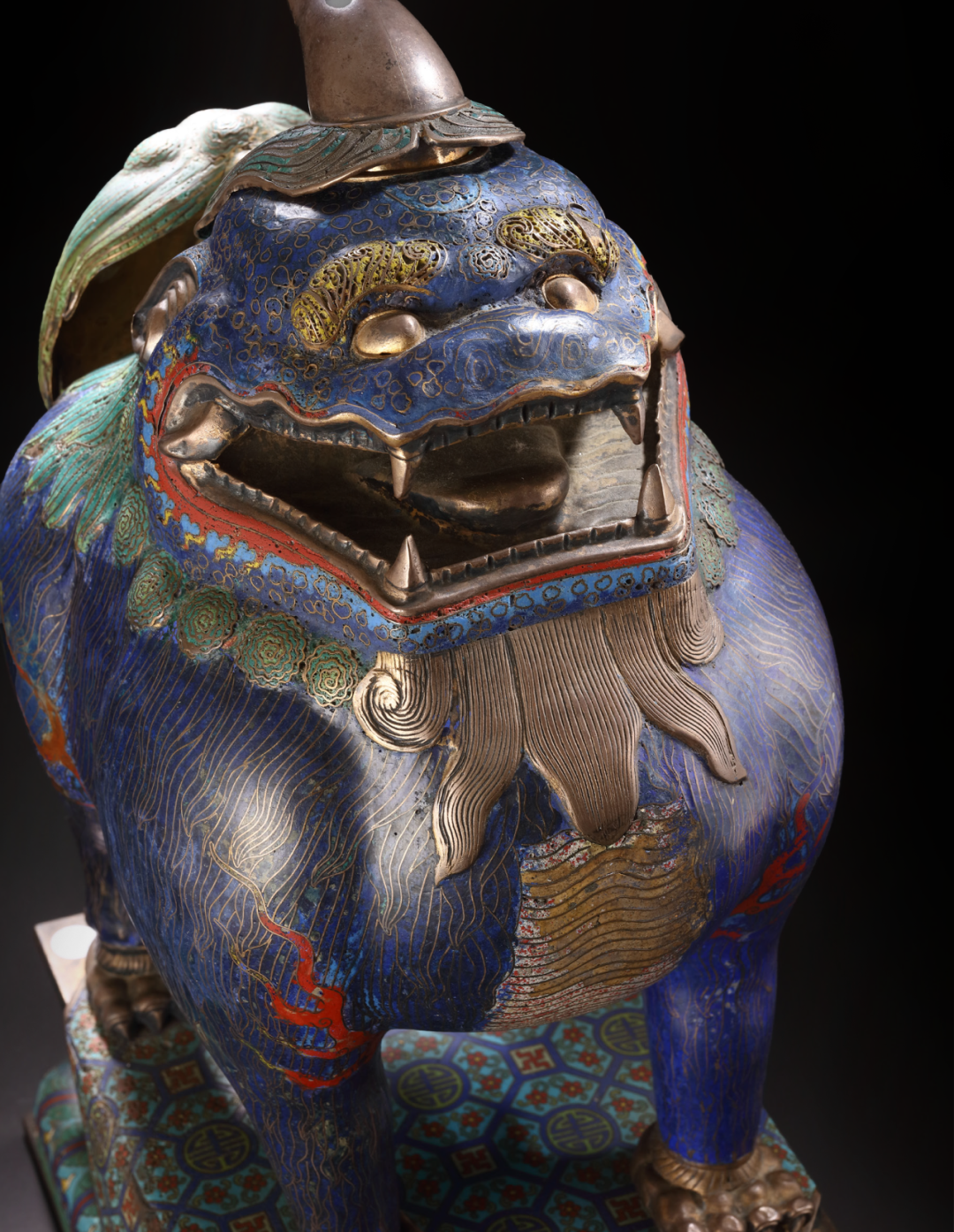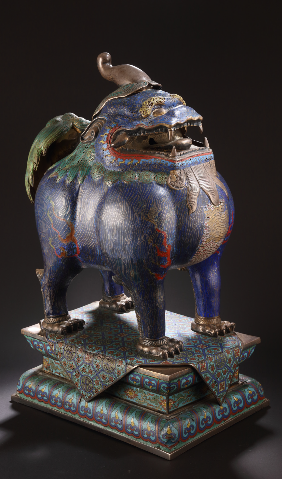 本件甪端以纯银为胎,体态丰满结实,犀角、狮身,四肢宛若龙爪,粗茁有力。昂首向上,双目有神,气势威严。腹部中空,因此可作香熏使用。通体以天蓝色珐琅釉为地,披肩长鬃则以錾胎为之轮廓,填掐丝绿蓝黄等彩釉,诸色交辉,层次宛然。甪端的角为盖,盖内又于银胎上鎏金,细节处亦如此精彩。