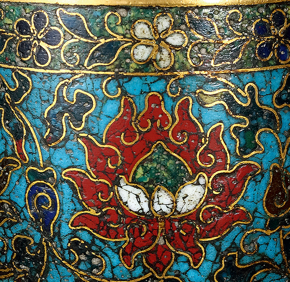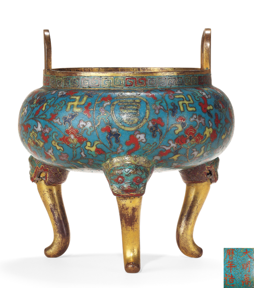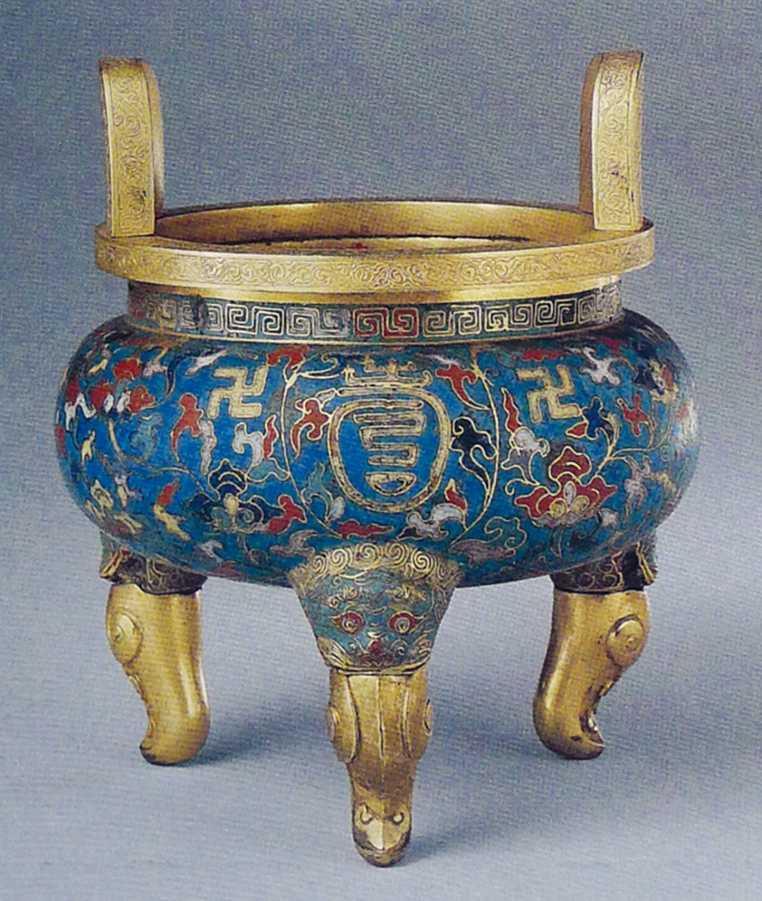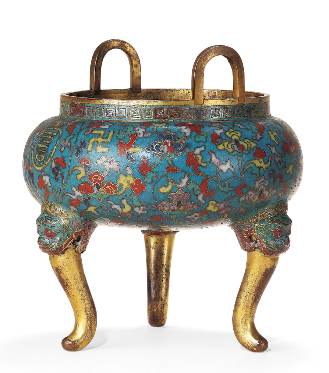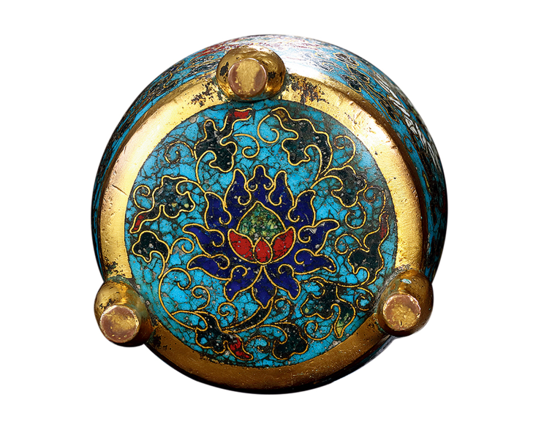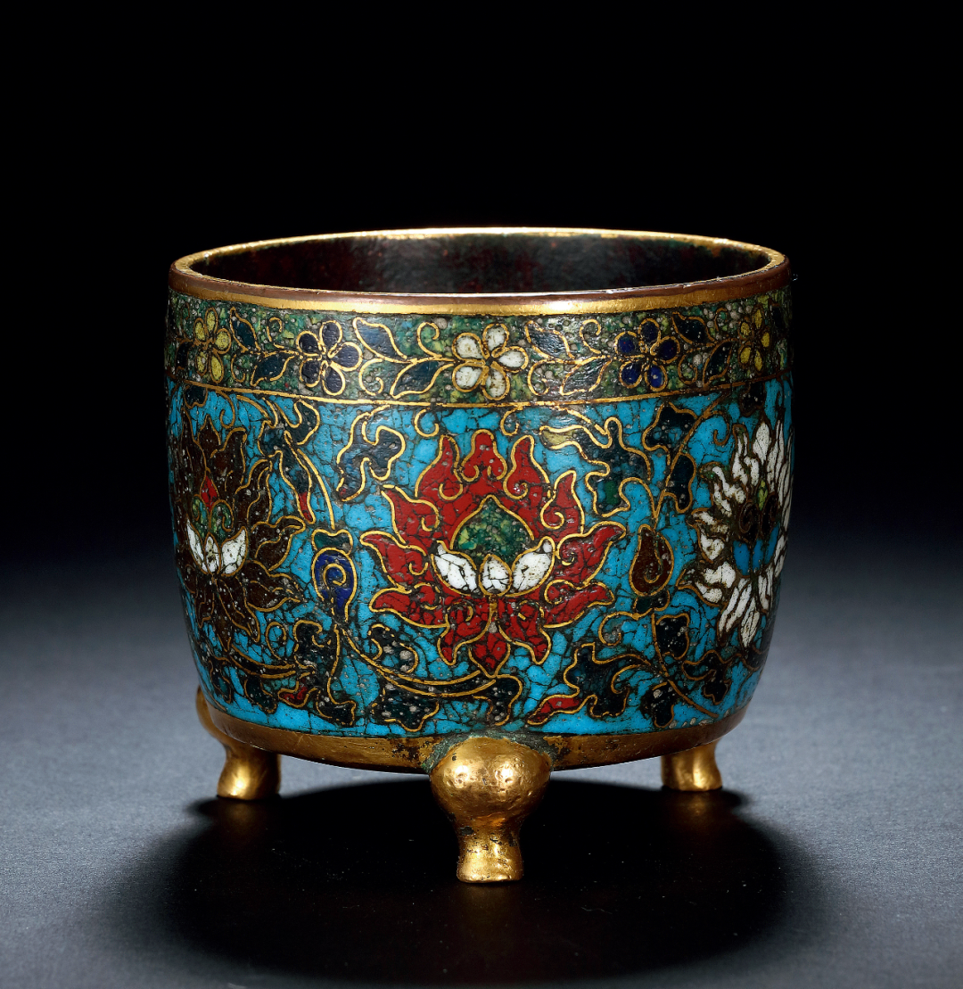 掐丝珐琅俗称「景泰蓝」,自元朝建立以后,同西亚一直保持着密切联系,来自西亚的珐琅工艺也由此开始与本土巧思相融合,发展出独具特色的掐丝珐琅艺术。是炉筒形腹,三蹄足,口沿及足部鎏金,色泽澄黄莹润,光亮柔和。炉外壁口沿下以宝石蓝釉为地,饰缠枝花卉纹一周;腹部以天蓝色釉为地,其上掐丝填以各色珐琅釉:宝石红、栀子白、葡萄紫、绛黄等四色硕大饱满的缠枝莲花对称分布,花朵绽放,极为悦目,间以绿彩填饰掌形枝叶,枝蔓伸展自如。此炉珐琅质地坚硬、致密、细腻、肥厚,色彩纯正均匀、鲜艳明快,工艺熟练,莲花拼接而成,一长丝掐出一叶三歧叶,为典型明代掐丝工艺,加之釉料发色,皆具有明显的时代特征,为明中期珐琅佳作之代表。