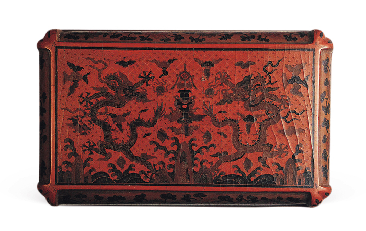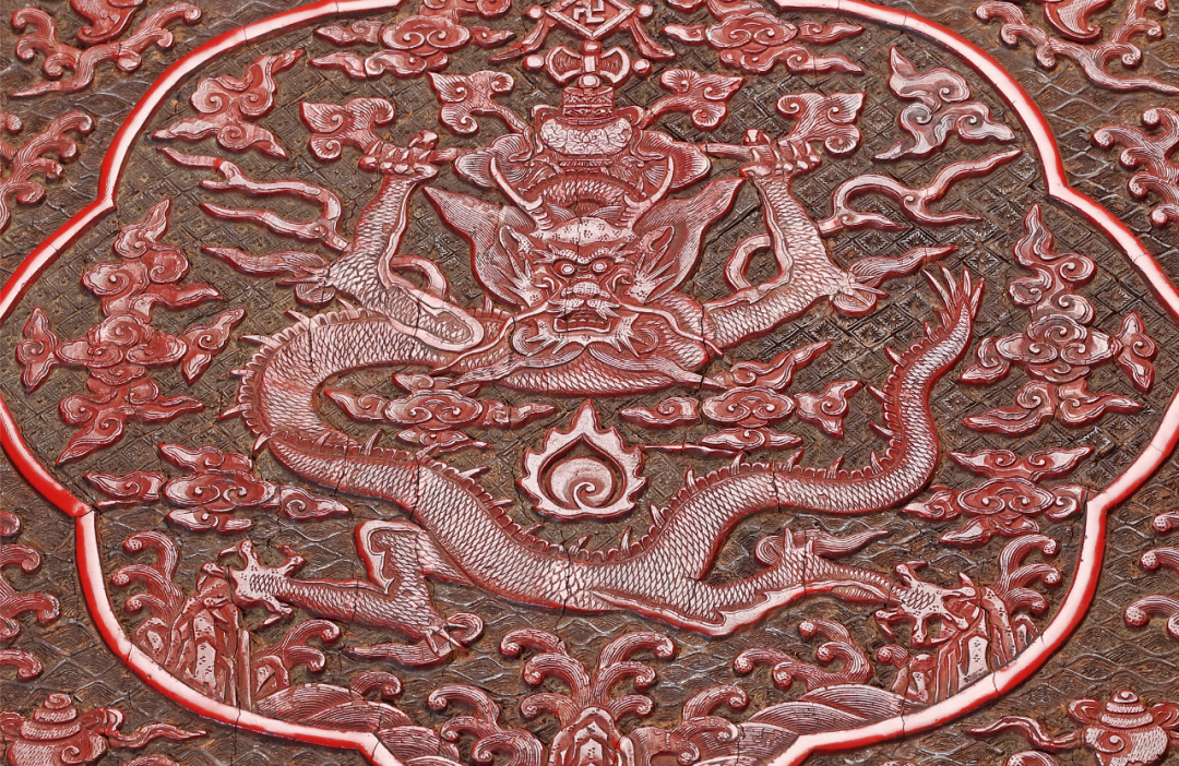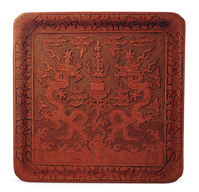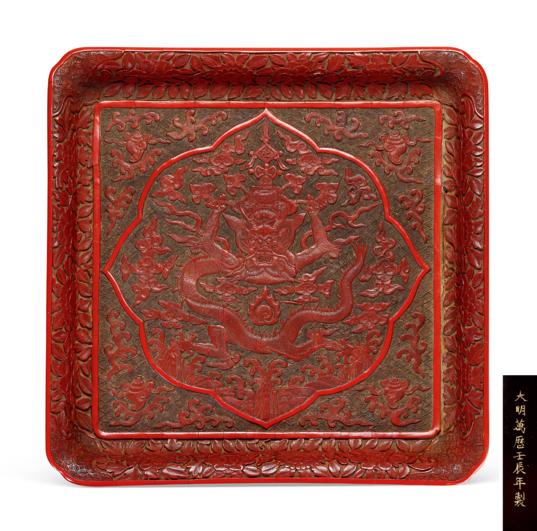 盘呈弧角四方形,敞口,方圆唇包边出棱,浅腹,斜壁稍外弧,底承矮圈足。器底髹褐漆,近足处竖款描金楷书“大明万历壬辰年制”款,字迹规整,笔划有力。按壬辰年,即明代万历十九年(1592年),属其在位中期时作品,洗练洒脱的龙纹形象颇具特色。菱形开光内雕正面龙纹,身形拉长,呈桥形拱起,腾空于云海之中;海水江崖之上,龙前爪上举,顶托宝瓶,内插戟,上悬磬,寓 “吉庆平安”之美意,周饰流云。