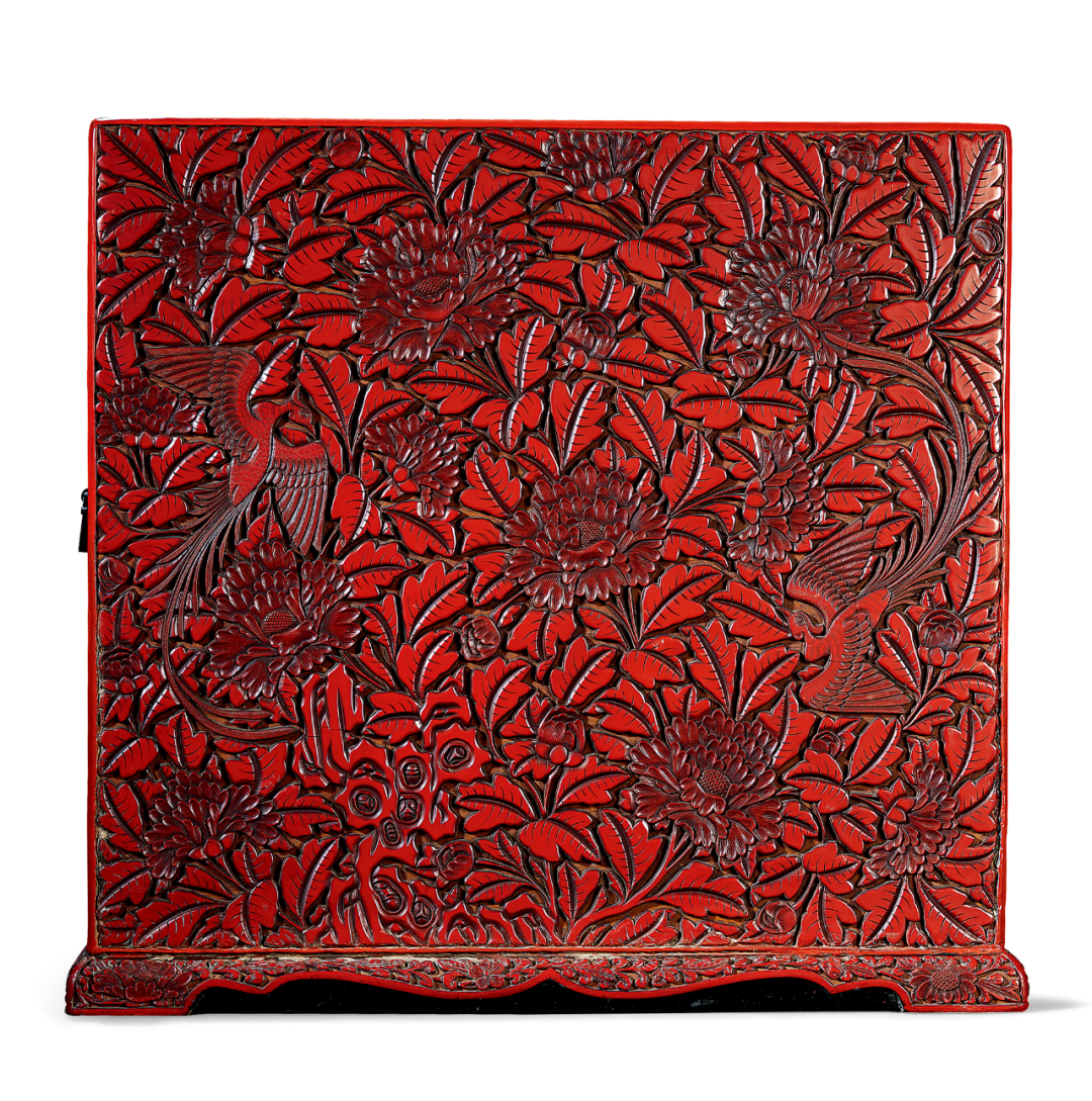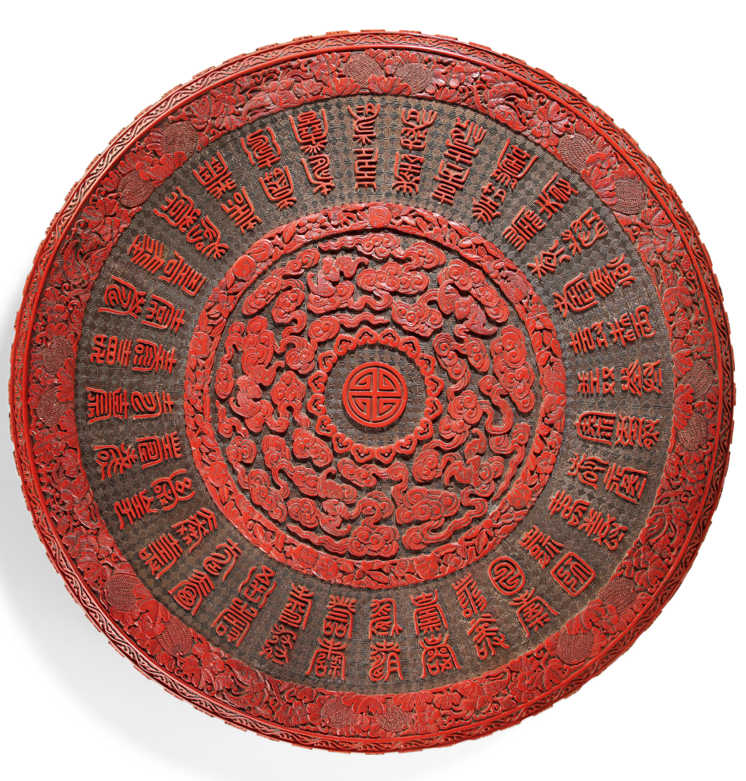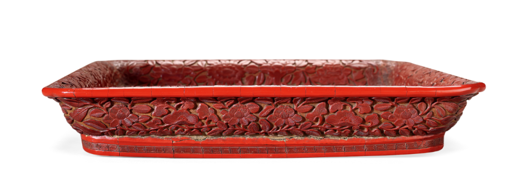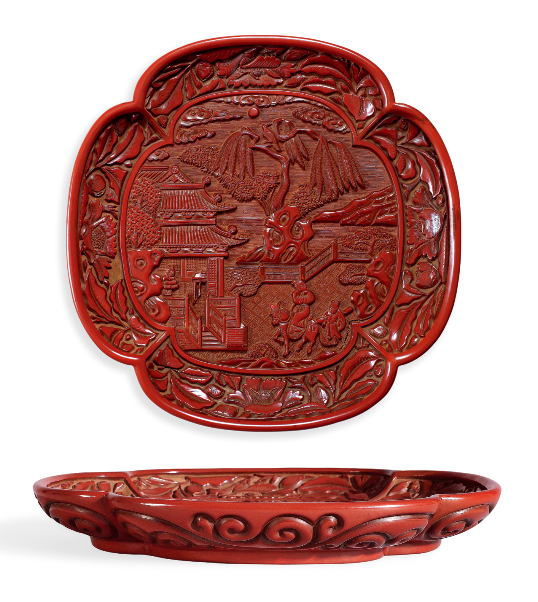 盘为四出海棠式,通体髹朱漆雕刻纹饰,盘心海棠式开光内锦纹地上雕携琴访友故事。庭院正中一棵苍松直入云霄,树干挺拔,枝叶繁茂,巧妙填补了盘心的空白,庭院四周搭配仙鹤、修竹、牡丹、洞石,水天之间点缀远山、流云,整个画面宛若人间仙境。盘内外壁均以黄色漆为底色,上施红漆于四开光内分别雕琢牡丹、莲花、菊花等花卉,花朵饱满圆润、花叶硕大繁茂,其形态与永宣青花瓷器上所绘花卉有异曲同工之妙。同种类的两朵花卉姿态并不完全相同,显示出匠师精益求精的创作精神。盘外底髹黑漆,上有断纹,平添斑驳古旧之感。本盘漆层厚实,漆色深沉,工艺考究,纹饰剔刻精美绝伦,刀口藏锋,刀法圆润,具有明代宣德时期之特征,故宫博物院、天津博物馆收藏有相似藏品,其雕刻手法、纹饰特征及款识均与本器相同,可互为印证。