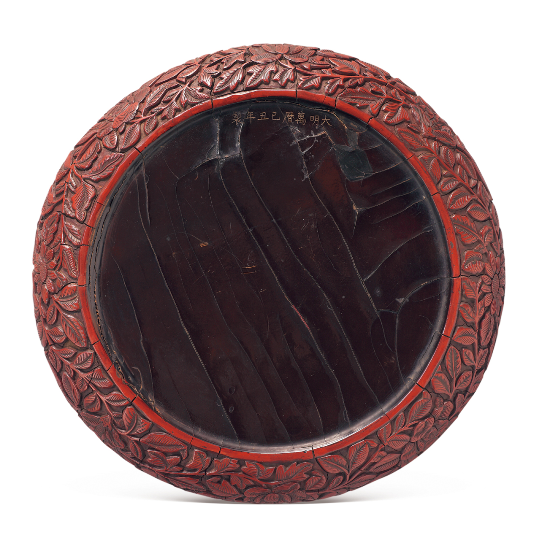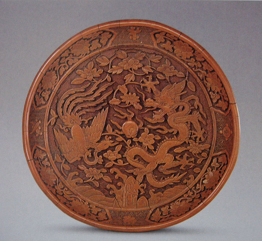 盘为敞口,通体髹朱漆,盘心内雕锦地龙凤戏珠与海水江崖纹。盘内壁作四开光,开光内满饰缠枝牡丹纹,四组开光之间并饰锦底花纹;外壁则浮雕缠枝牡丹纹,下承圈足,底髹赭色漆,一端近圈足处,署有刀刻填金“大明万历己丑年制”横书楷书款。