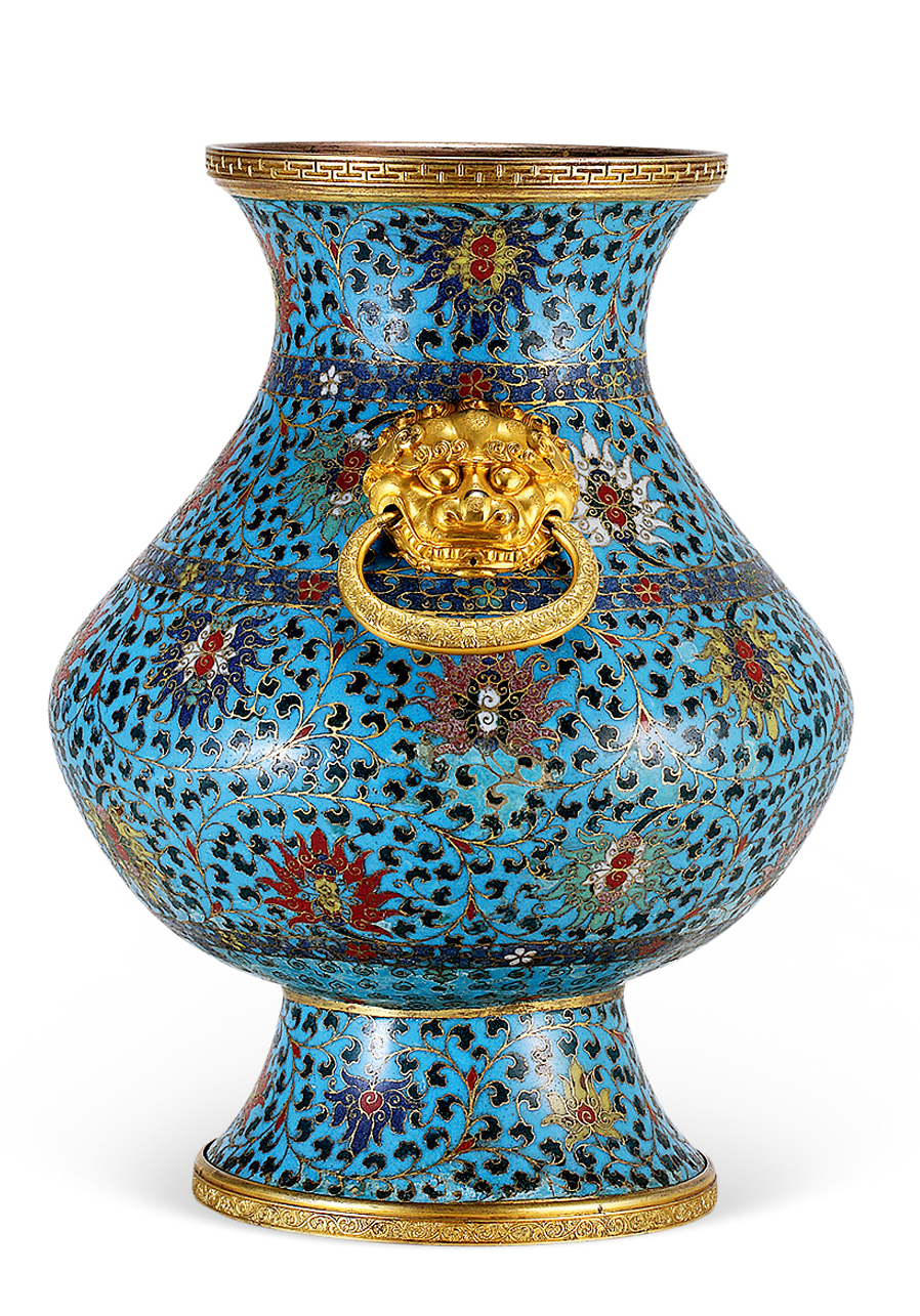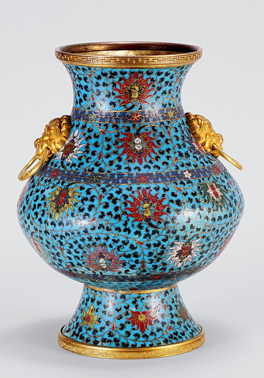这件双兽耳壶盘口、外侧有回形纹,方唇,口沿外卷,束颈溜肩,肩部两侧饰铜质铺首双兽衔环耳,圆鼓腹微下垂,高圈足,足外撇,造型取法上古青铜器,硕大恢宏,颇具气势。壶通体以天蓝色珐琅釉为地,满掐缠枝莲花纹样,花朵造型饱满,花茎粗壮,枝叶繁密,以宝蓝色填充枝干,红、黄、白、粉诸色装饰花朵,色彩艳丽饱满。壶的造型最早出现于春秋晚期,流行于汉代。明清两代掐丝珐琅器仿古造型颇多,多以商周青铜器为蓝本。本壶即为当时仿制商周青铜器的代表作,其花叶形态及排列方式尚有明代遗风。花瓣与花蕊颜色各不相同,则为清代早期掐丝珐琅缠枝莲的基本特征。整器造型大气威武,掐丝流畅大气,色彩丰富绚丽,壶底有“景泰年制”款,为清早期仿明掐丝珐琅之典型器物。