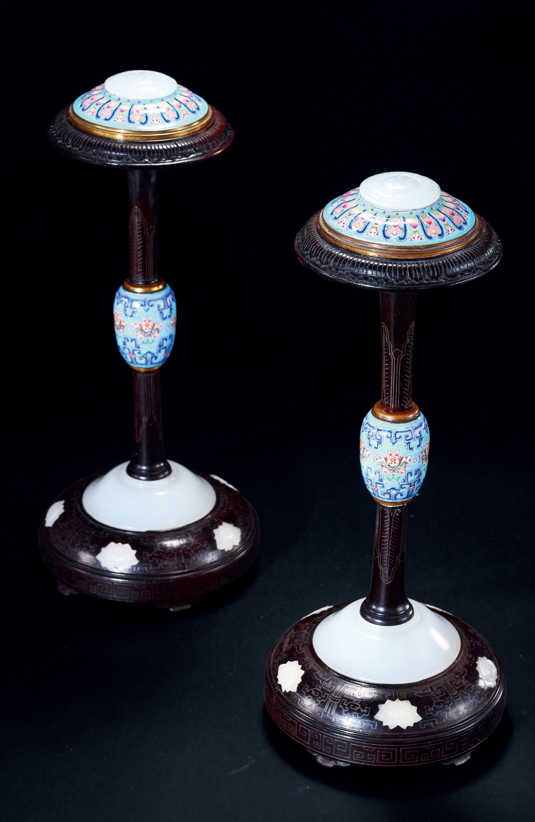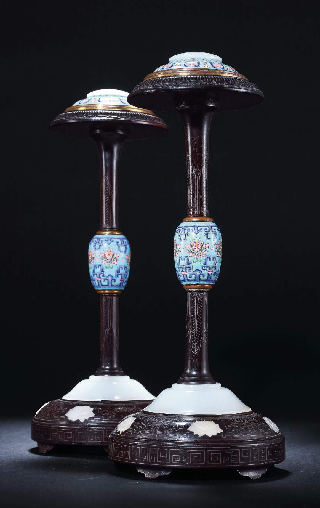此类冠架之圆顶、长柄格局乃乾隆朝首创,所涉材质林林总总;见一紫檀嵌玉类例,售于纽约苏富比2015年3月17/18日,编号230;另一例,大英博物馆蓄,曾展于东方陶瓷学会,《Chinese Jade throughout the Ages》,维多利亚与艾伯特博物馆,伦敦,1975年,编号463;再参见一玳瑁例,镶鎏金铜为饰,展于《清代广东贡品》,香港中文大学文物馆,香港,1987年,编号78;北京仍有一珐琅例,绘寿字及缠枝花卉纹,录于《清代宫廷生活》,香港,1985年,图版183。