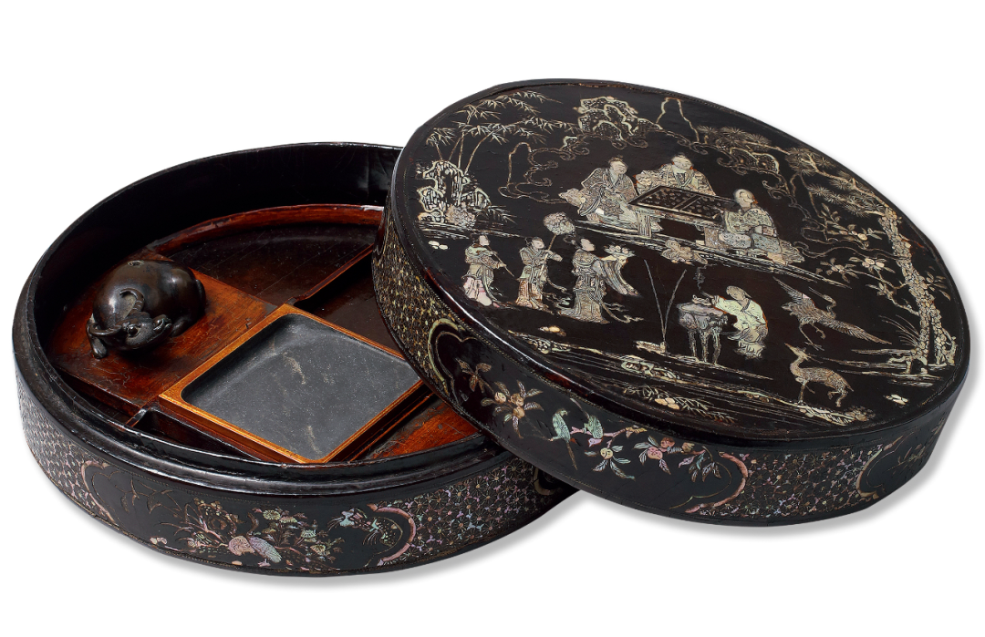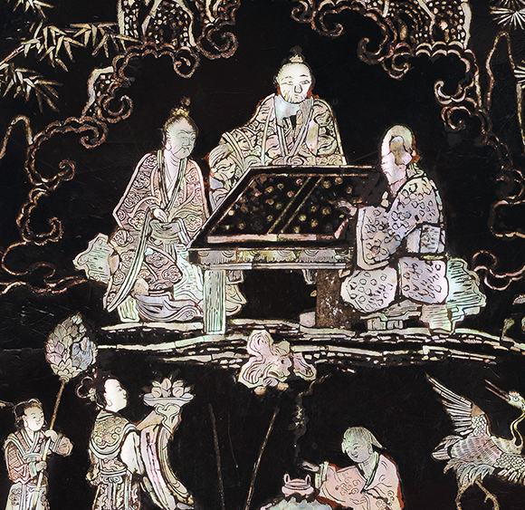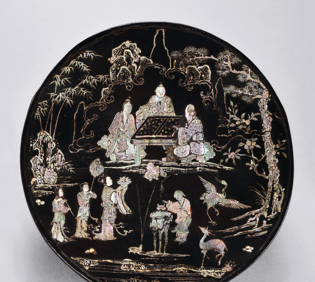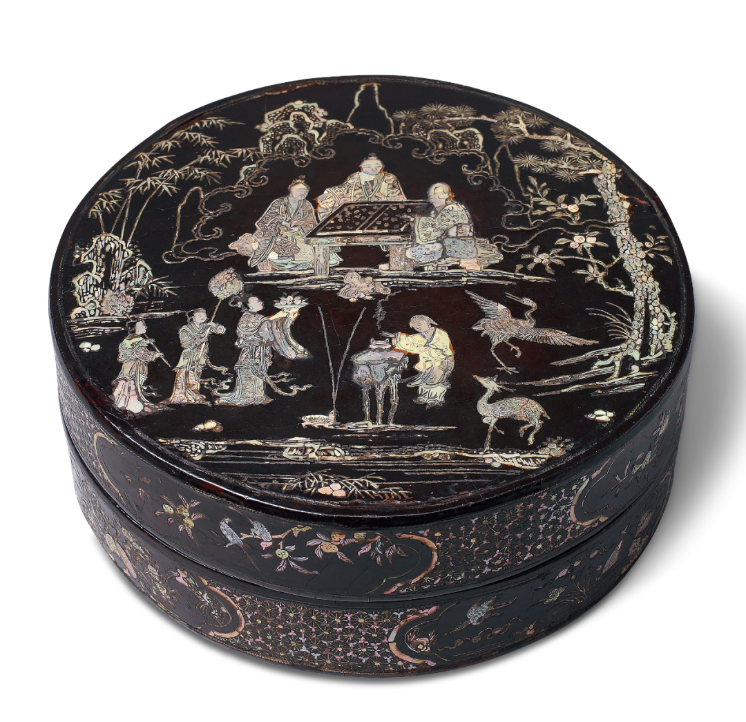 此器呈圆形,子母口,整体造型规整大方。器身通体髤黑漆,光亮润泽,其上以螺钿镶嵌纹饰,外壁上下层各有四开光,内饰花鸟,开光外为六棱花。盖面嵌绘仙人故事图案,远景仙云层峦,近景山石松竹,画面正中有福禄寿三星围桌下棋,下方一仙女手捧寿桃,后有二仙童持扇相随,右隅一童焚香,仙鹤展翅回首,瑞鹿驻足昂首。整幅画面构图层次分明,布局繁而不乱,人物脸部、服饰镶嵌精致,神态兼备,衣褶表现自然逼真。黑漆色泽典雅庄重,间配以螺钿装饰,色彩变化多样,绚丽斑斓,于古朴器型之间呈现优雅富贵之态。此器图绘因螺钿博巧而色彩纷呈,集人物、花卉景物于一器,为同朝作品中之佳作。