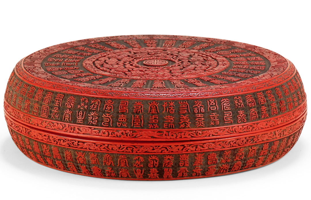 捧盒呈圆形,盒内及盒底髹黑漆,并洒金点缀,整器以各式“寿”字为主题纹饰。盒盖中央雕圆形“卍”字纹,其外依次环绕如意云头纹、云蝠纹、带状折枝花卉纹、“寿”字纹、瓜蝶纹,其中所雕五只蝙蝠飞绕于云气之间,配以带有瓜瓞绵绵之美意的纹饰,更是寓意吉祥。