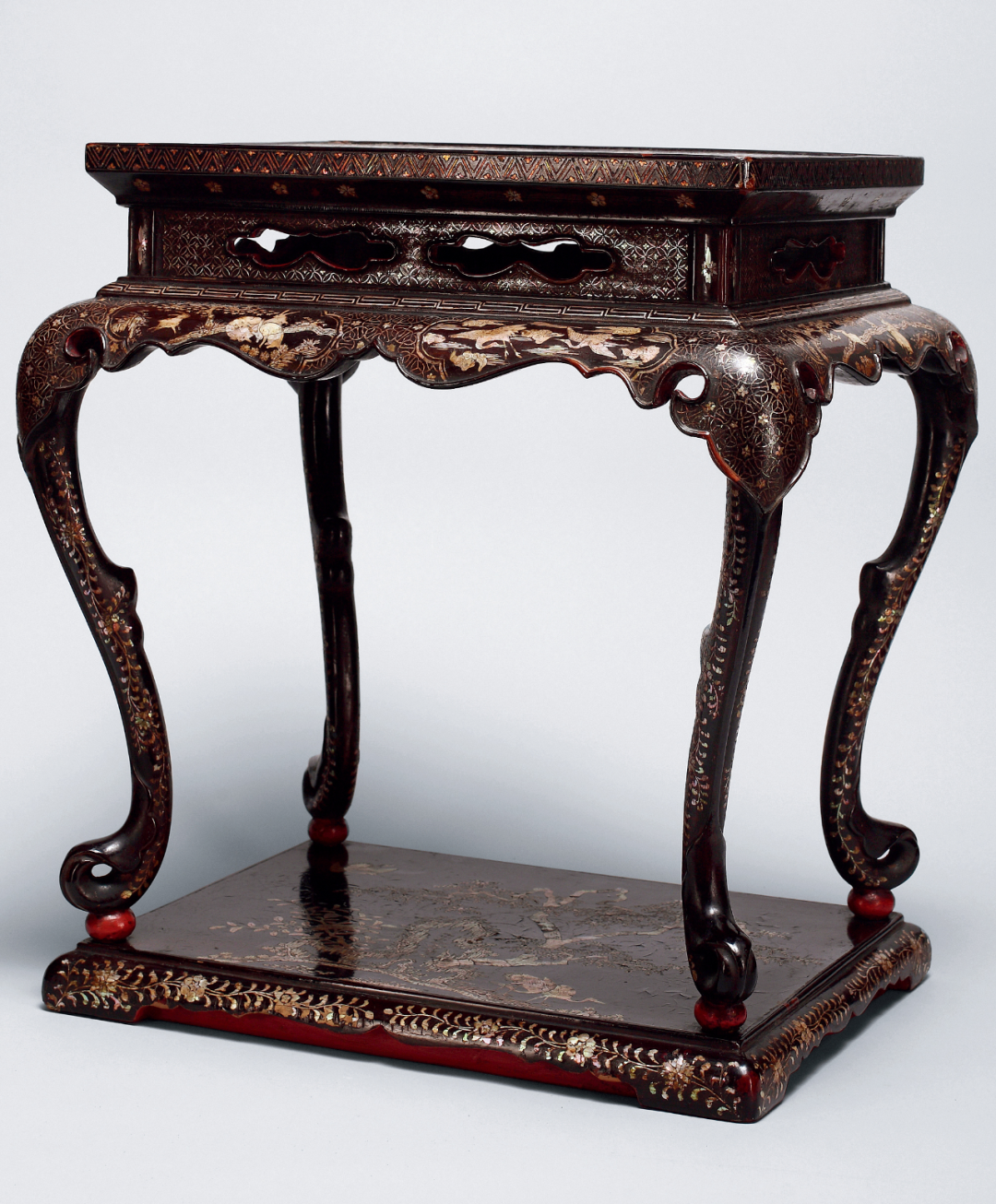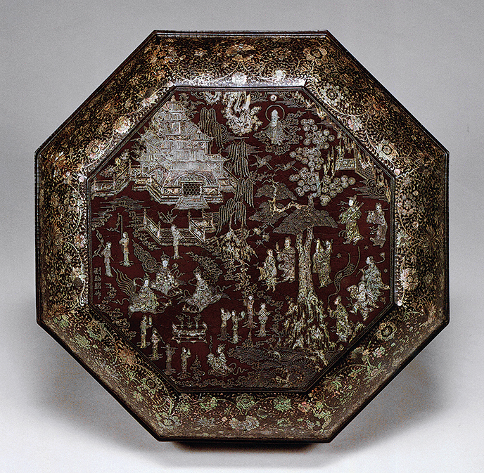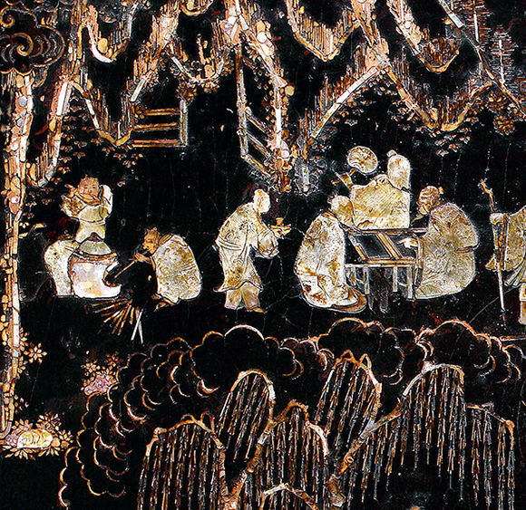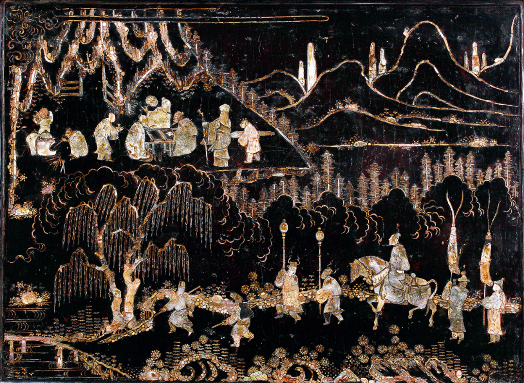 螺钿嵌工艺始创于西周时期,及至明末清初达至高峰,其是用在髹漆工艺上的一种装饰手段,主要是采用螺蚌之贝壳,将其珠光层加以磨薄磨光加工成薄片后,制成人物花草鸟兽等形象嵌入预先雕成的凹形图案内,再髹上一层光漆,于后磨平抛光使其露出钿片,由此形成色彩艳丽的嵌螺钿器物。此件黑漆嵌螺钿衣锦还乡矮几形制华美,装饰艳丽高雅,兼具实用与装饰之功。