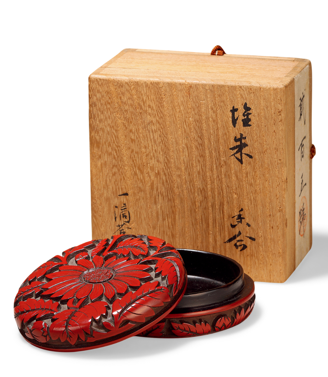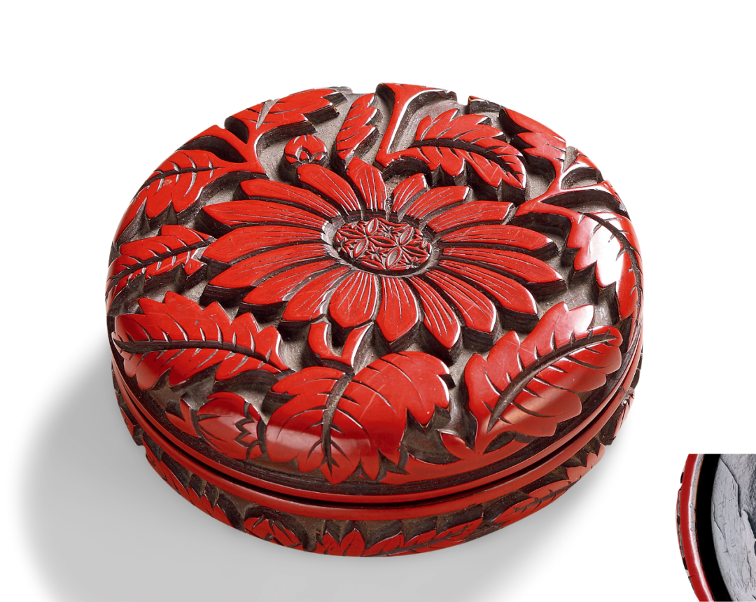盖盒整体呈圆形,直壁,平底,盒盖与盒身子母口相扣合。器表通体髹朱红漆,色泽光润,盒内壁及外底髹黑漆。盒盖及外壁剔红饰菊瓣纹,花枝肥厚,刀法细腻,外底近圈足处一隅以针刻画“张成造”三字行楷款。所雕菊花盛开怒放,与茂密的叶子相映成趣,彰显一派生机。盒盖布局与故宫博物院藏张成造剔红栀子花纹盘极为相似(参见《中国漆器全集4三国-元》,页175,图159),均以一朵盛开的大花为主题纹饰,四周辅以四朵小花装饰。此盒面满雕一朵盛开的菊花,四周伴有枝叶,底髹黑漆,断纹自然,为元代特有形态。全器漆色鲜红,色彩纯正,布局层次分明,雕刻筋脉舒卷有力,刀法浑厚宛转,藏锋不露,磨工精细圆润,是张成传世雕漆中之代表作品,极为珍罕。