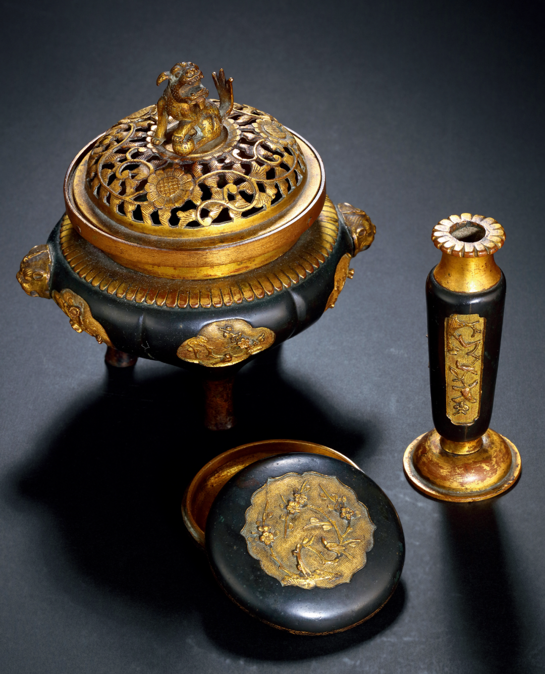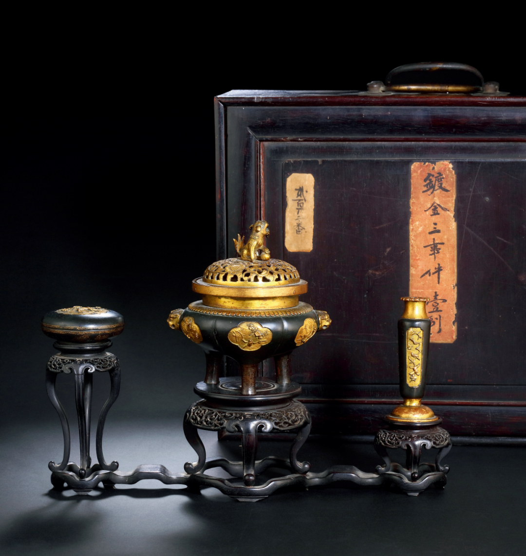 香炉呈鬲式炉造型,炉身四面海棠形开光,内錾刻花卉图案,腹部两侧对称兽首形铺首,盖镂空、上有狮钮,炉口多处鎏金,口沿外侧则为乌黑黝亮之皮壳,与鎏金对比强烈,系造办处特有之皮壳上色工艺;盒呈扁圆形,圆形口、足,子母口扣合,盒盖上部菱口开光,开光内堑刻细密的鱼子纹为地,上作喜鹊登梅纹饰;香瓶腹部开光,内饰花鸟图案,构图饱满,装饰意趣浓厚,小巧精致,高挑挺立,气势凛然。炉、瓶、盒三式组合自十五世纪明早期就已出现,其后盛行于清代,是宫廷重要的陈设用品。此组炉瓶盒三事,端庄富贵,精铜铸造,錾刻鎏金,数百年来包浆自然,光润可鉴,古代宫廷造器之法度乃非精铜不铸器,非佳器不鎏金,足见此套拍品之贵,并且成套保存,更加难得,乃收藏之佳器。