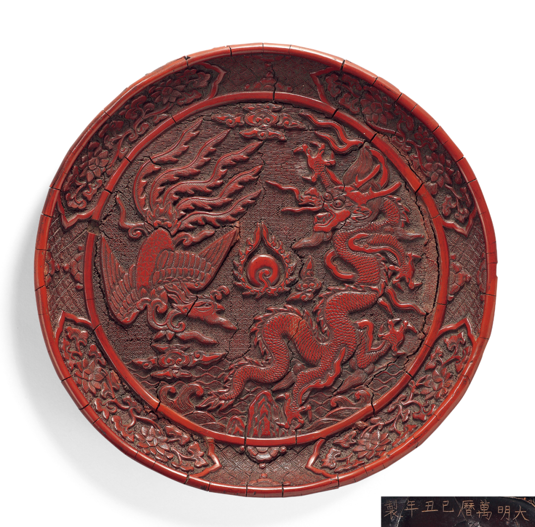 漆器落年号款的做法,始于永乐朝,一般是在器底针刻六字款。宣德时期,六字年号款多刻于器底或侧面,再填金料,后期的明代器物亦以此为规范。但万历后期,如此器所刻的八字干支年号款渐超普遍。在已发表的万历漆器中,最早的干支年号为“乙酉”即1585年,其他干支则以十六世纪九十年代为多,如此器落“己丑”(即1589年)款者即是如此。是类龙凤戏珠漆盘是明代万历时期的典型装饰题材,如北京故宫博物院即藏有类似题材的剔彩、剔黄等龙凤纹盘。详见故宫博物院文物珍品全集《元明漆器》,页205。