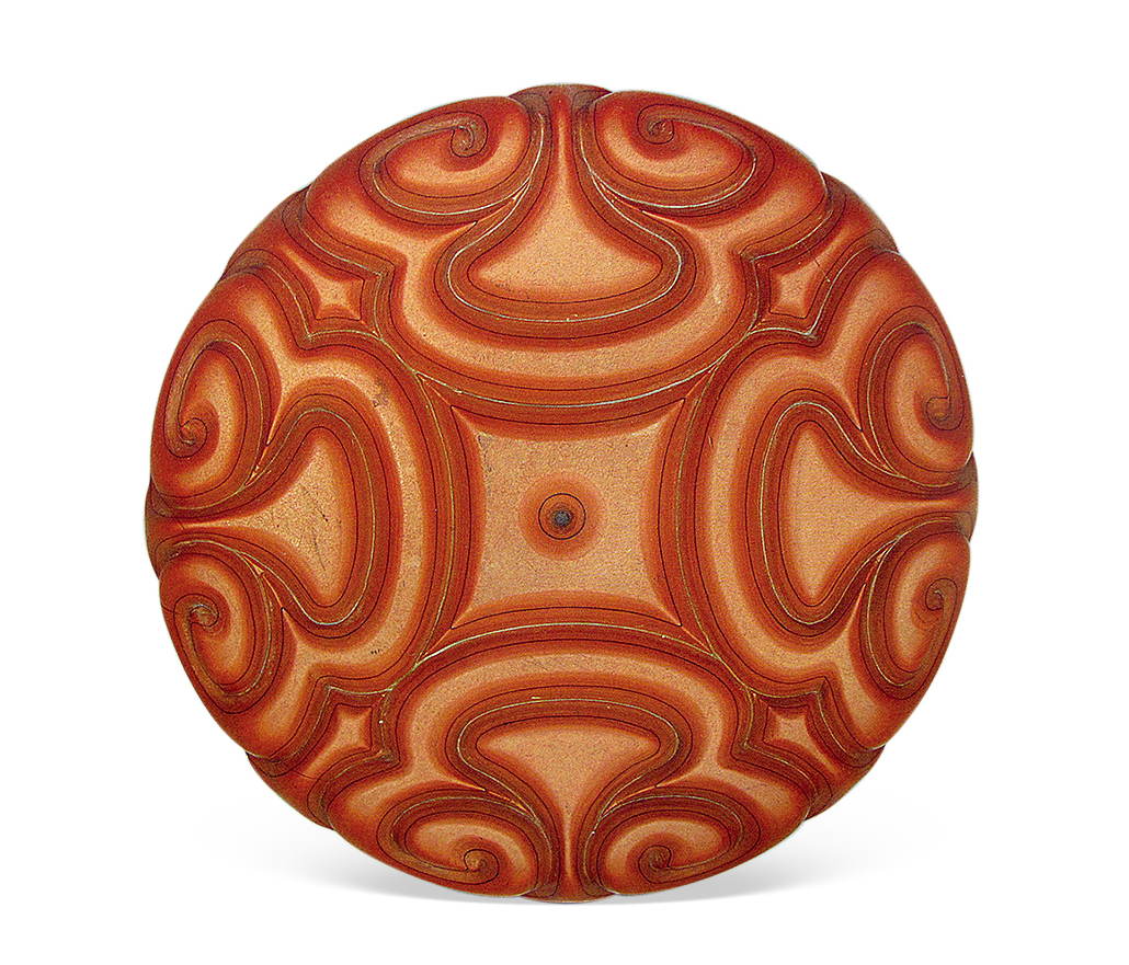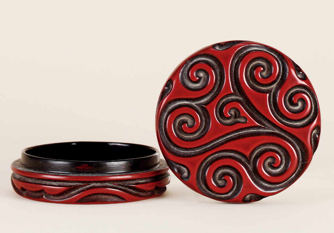 圆形漆盒,子母口,盖面平,浅腹,平底。外面髹红漆,内面髹黑漆,盒底外髹褐色漆。盖面及腹外壁剔雕卷云纹,纹饰立体一,线条流畅舒畅。明黄成《髹饰录》:“剔犀有朱面,有黑面,有透明紫面。或乌间朱线,或红间带朱,或三色更叠。其文皆疏刻划、线环、重圈、回文、云钩之类。纯朱者不好,明代剔犀有黑面、朱面两种,多不属款识。本品堆漆肥厚,刻工圆润,刀口深约达1厘米,漆光滢滑照人,形制古朴淳厚。细观其刀口,于断面显露出不同颜色的漆层,达到富于的装饰艺术效果。此盖盒漆色纯正,纹饰线条简练、流畅大方,灿然成纹,流转自如,回旋生动,颇为精彩。
