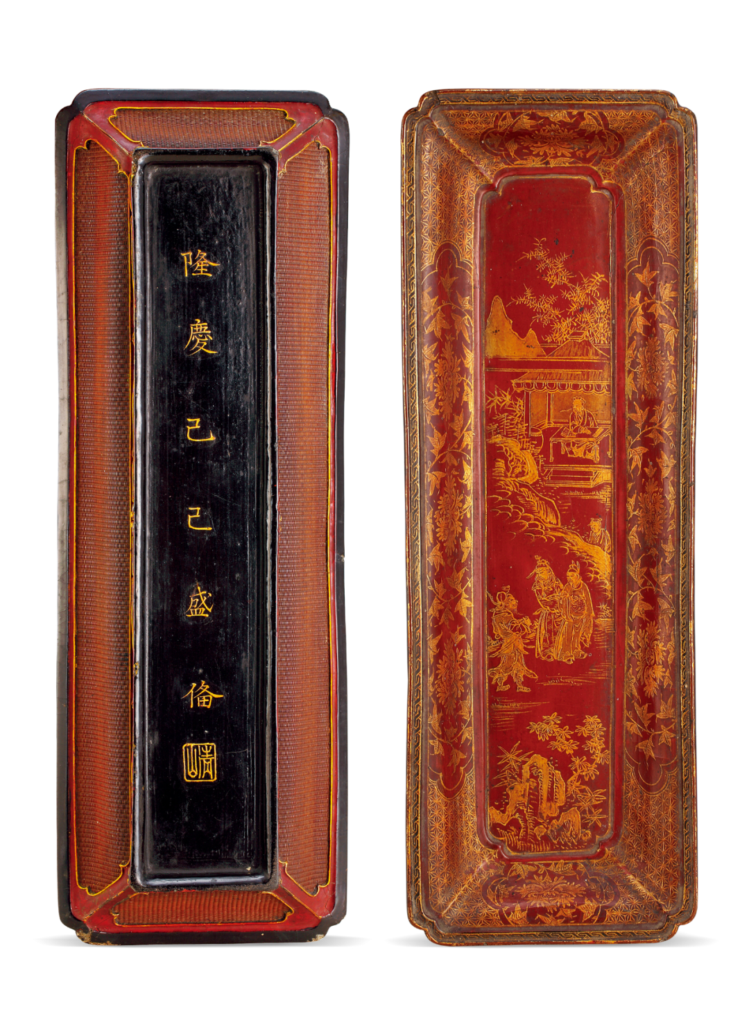 漆盘呈长方形,弧壁倭角,底承壸门式圈足。外壁四面描金开光内镶竹丝,编制规整,颇具特色,当为南方所制。盘心红地金漆描绘纹饰,四壁开光内饰缠枝花卉,枝叶舒展,富贵气象;正中则绘山水人物,树石亭台之间,人物神态各异,生动鲜活。器表以罩金漆工艺为之,透明漆不仅利于保护纹饰,又差异于“明金”,具有一定的研究价值。“罩金漆”,即笼罩漆,又简称“金漆”,载于明晚期的《工部厂库须知》。是将优质色浅的熟净漆精滤后兑入熟桐油,酌加藤黄,呈半透明金红色的一种大漆,常被用于罩髹漆器的贴金地子,是明清时期用途广泛一种涂料,北京故宫博物院太和殿的金漆龙纹屏风、宝座即是罩金漆家具的典型实例。器底正中书“隆庆己巳盛俻”楷书款,后落“清山”印,为明隆庆在位早期时所作。整器纹饰以细线巧妙勾勒而成,布局疏密有致,繁而不乱,红地金漆极具装饰之效。