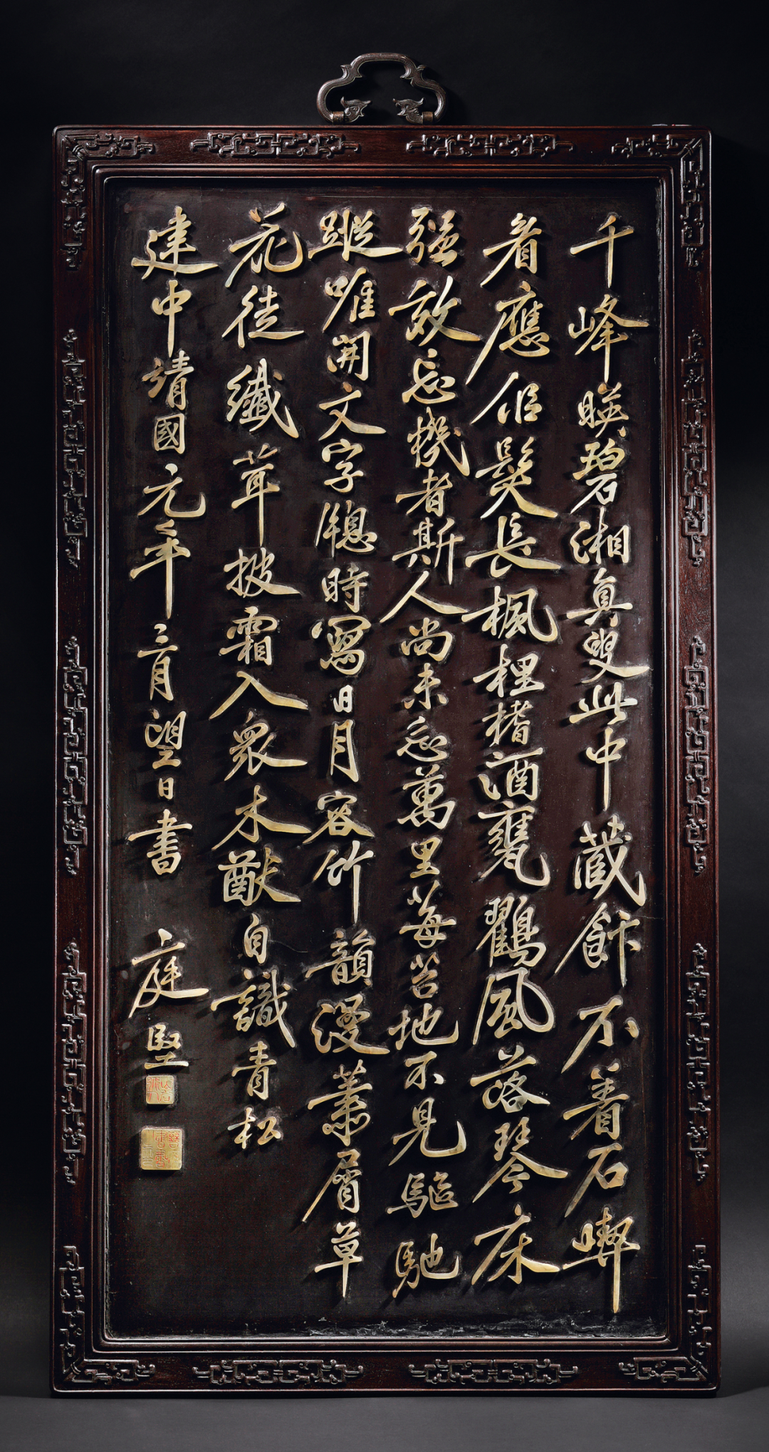 挂屏边框为紫檀木制,铲地浮雕拐子龙纹,打磨精细,刀法利落。屏心髹黑漆为地,其上以青白玉嵌黄庭坚行书唐代孟郊五言古诗两首,一为《怀南岳隐士》,诗文为“千峰映碧湘,真隐此中藏。饼不煮石吃,眉应似发长。风榸支酒瓮,鹤虱落琴床。虽斅忘机者,斯人尚未忘。”一为《寻言上人》,诗文为“万里莓苔地,不见驱驰踪。唯开文字窗,时写日月容。竹韵漫萧屑,草花徒蒙茸。披霜入众木,独自识青松。” 笔画遒劲郁拔,而神闲意秾,表现出黄庭坚大字行书的独特特点。黄庭坚,字鲁直,自号山谷道人,晚号涪翁,又称豫章黄先生,洪州分宁(今江西修水)人。北宋诗人、词人、书法家,为极盛一时的江西诗派开山之祖,为北宋书坛杰出的代表,与苏轼同为一代书风的开拓者,存世作品大都收藏于两岸故宫等海内外重要博物馆,市场流通罕见,于北京保利2010年春拍上拍的《砥柱铭》,成交价达4.368亿元,创中国艺术品拍卖世界纪录。
