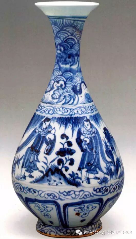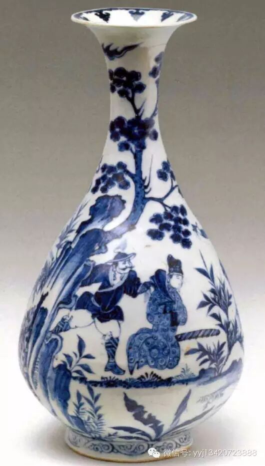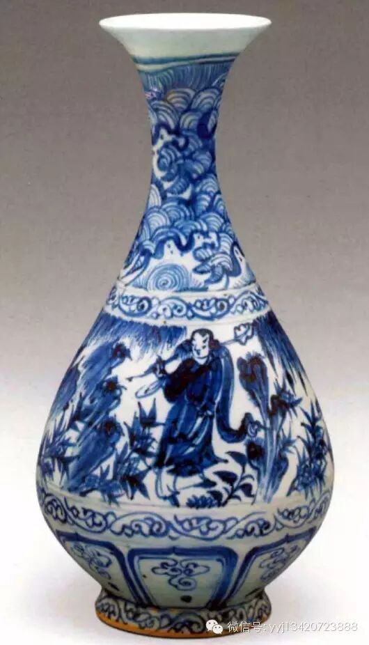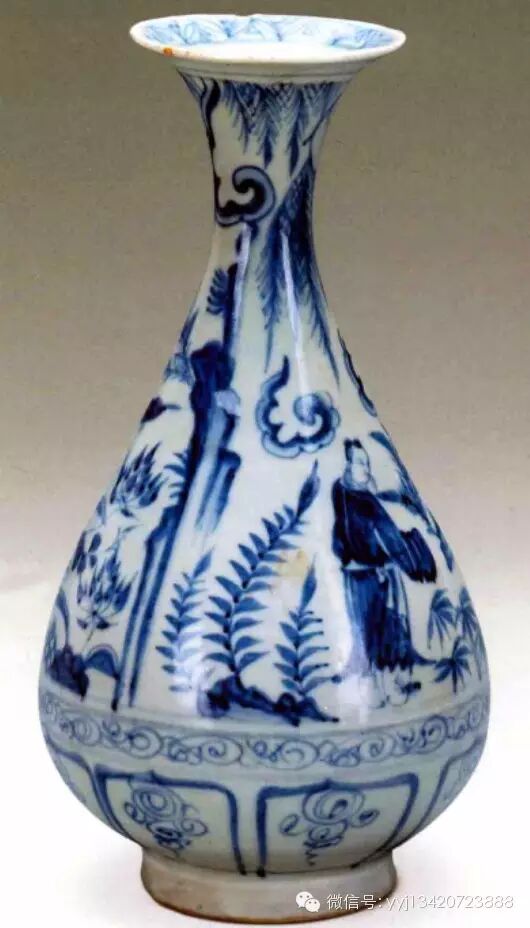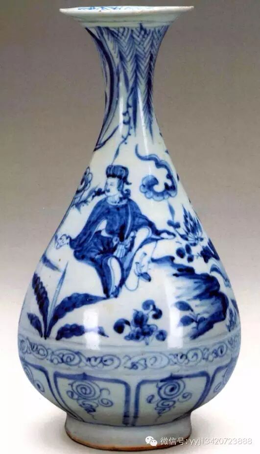 青花人物图玉壶春瓶 元 高27.5厘米 口径87.5厘米 足径8.2厘米 1986年江西省上饶市北门乡东瓦窑村元代墓葬出土 上饶市信州区博物馆藏