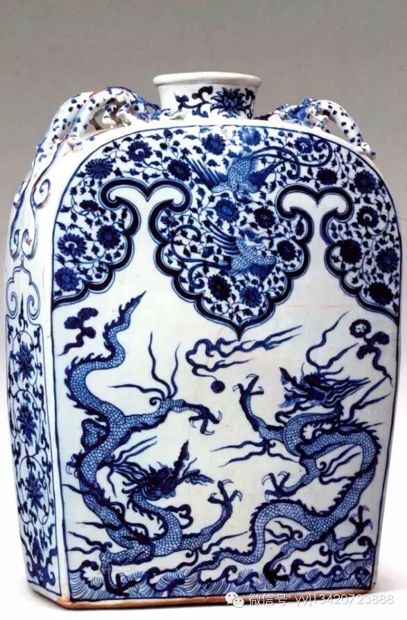 青花云肩双龙戏珠纹四系扁方壶 元 高38.9厘米 长28.5厘米 宽9厘米 日本出光美术馆