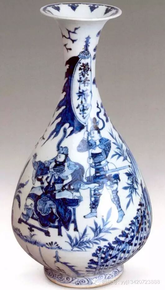 青花蒙恬将军图玉壶春瓶 元 高29.5厘米 口径8.4厘米 足径9厘米 1956年湖南省常德市桃源县出土 湖南省博物馆藏
