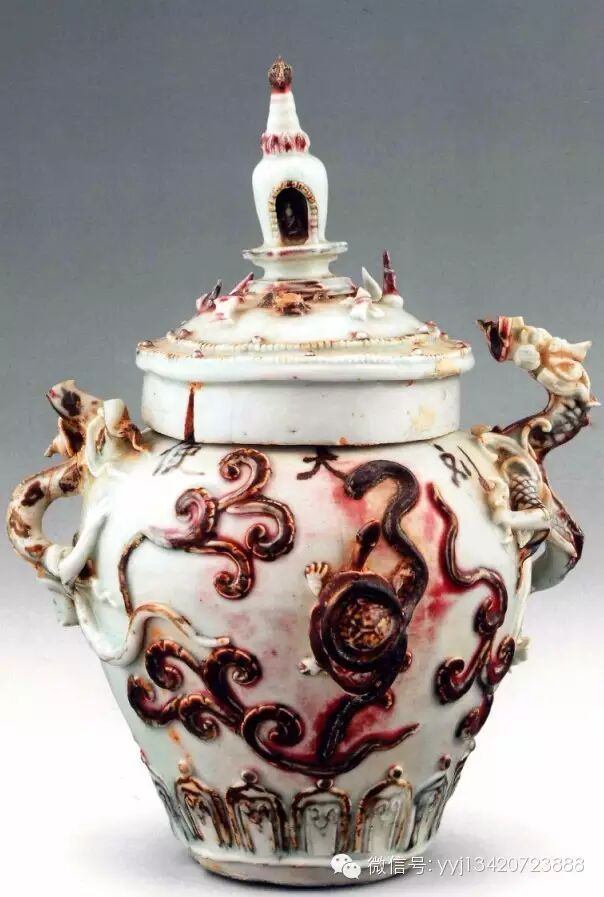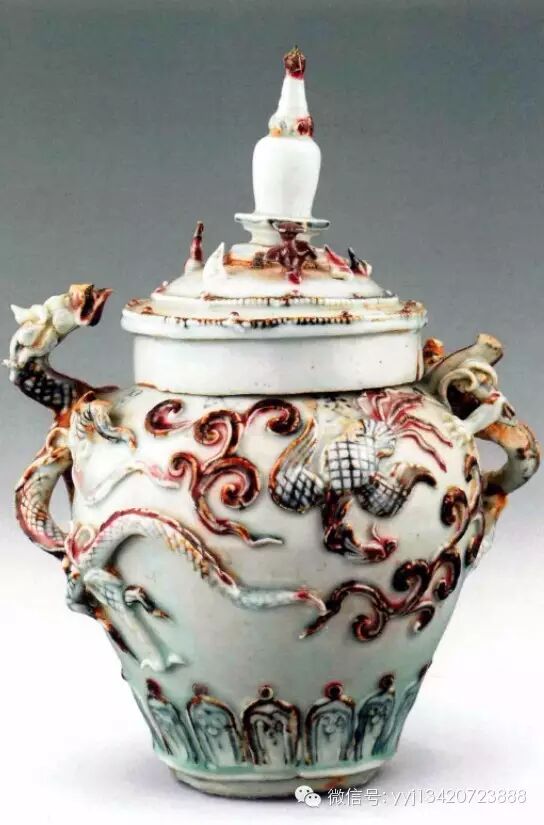 青花釉里红堆塑四灵塔式盖罐 元 通高22.5厘米 口径7.7厘米 底径6.6厘米 1974年江西省景德镇市郊后至元四年(1338)凌氏墓出土 江西省博物馆藏