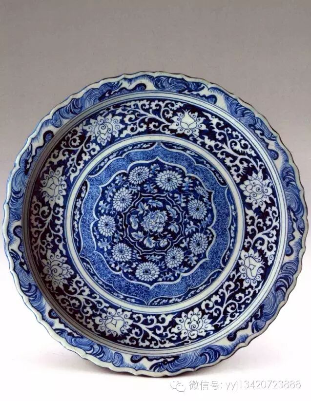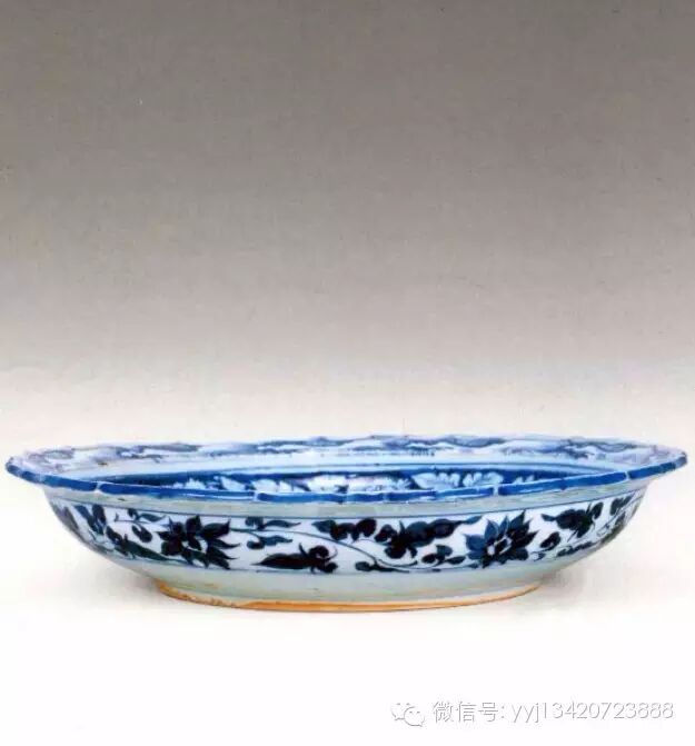 青地白花缠枝花卉纹菱口盘 元 高9厘米 口径45.3厘米 足径24.2厘米 日本大阪市立东洋陶瓷美术馆藏