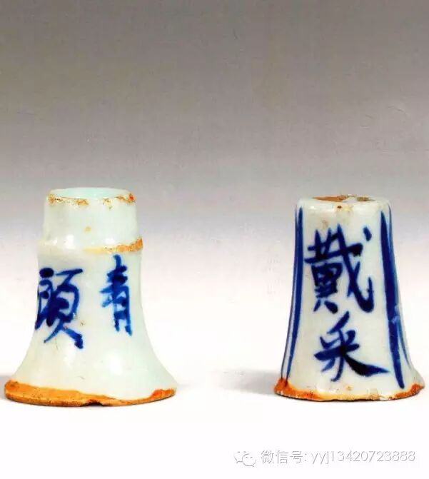 青花“头青”、“戴采”铭试样 元 高4.7厘米 高4.5厘米 1980年江西省景德镇市落马桥元代窖藏出土 景德镇市陶瓷考古研究所藏