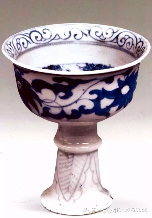 青花诗句缠枝花卉纹高足杯 元 高9.5厘米 口径11厘米 足径5厘米 1980年江西省高安市元代窖藏出土