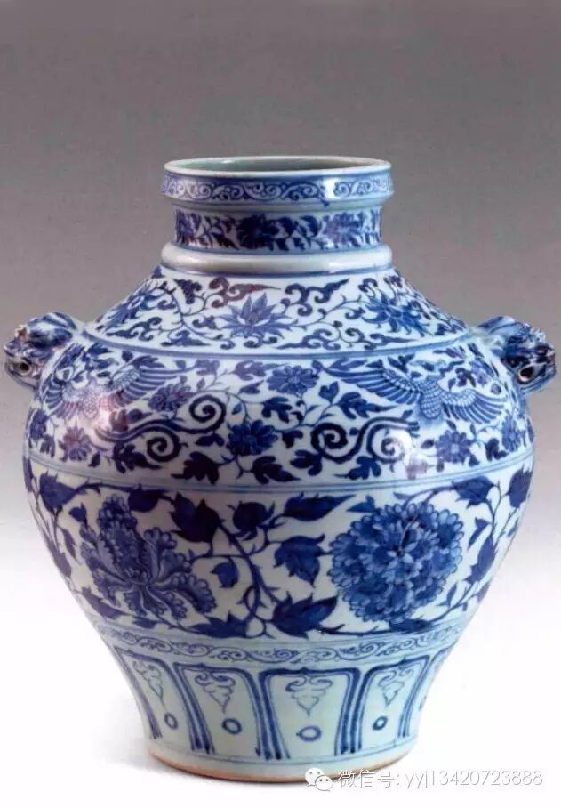 青花缠枝牡丹凤穿花卉纹兽耳罐 元 高38.5厘米 口径14.2厘米 足径17.8厘米 上海博物馆藏