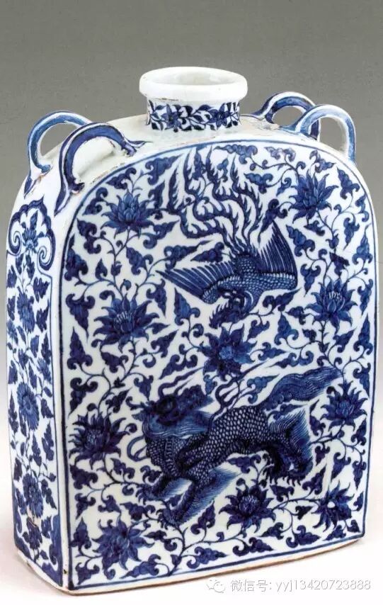 青花凤凰瑞兽穿花纹四系扁方壶 元 高36.3厘米 长26.3厘米 宽9.6厘米 伊朗国家博物馆藏