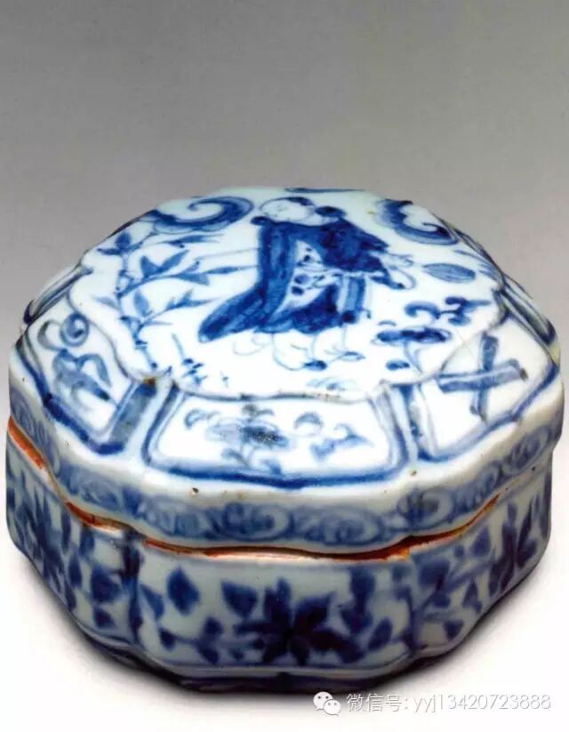 青花人物杂宝纹六棱形盖盒 元 高7.7厘米 口径9厘米 足径8厘米 英国大英博物馆藏