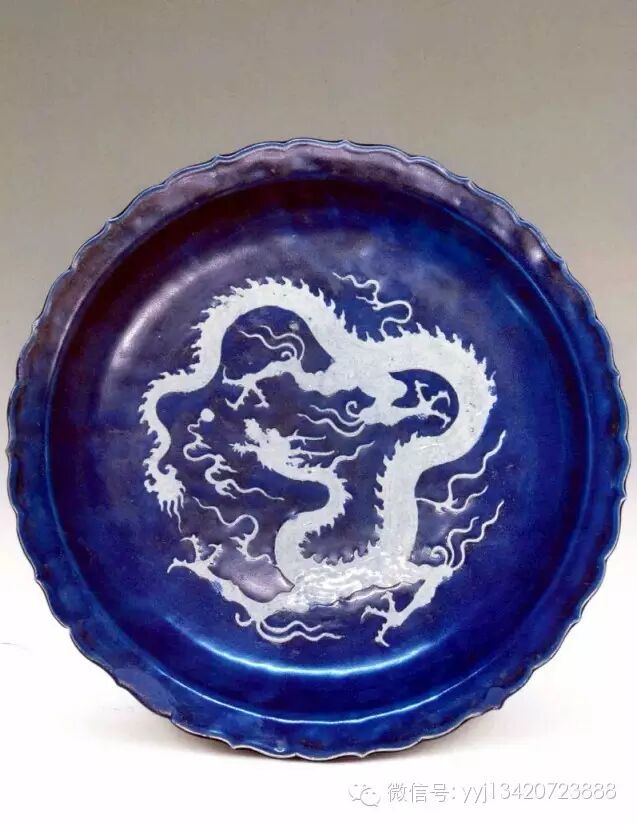 蓝地白花云龙纹菱口盘 元 高7厘米 口径46厘米 足径27.5厘米 伊朗国家博物馆藏