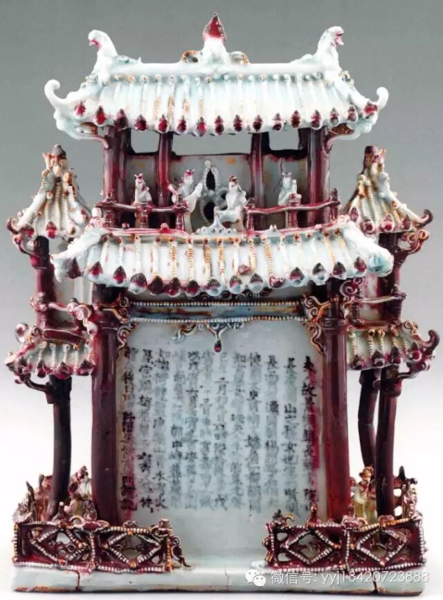 青花釉里红堆塑人物楼阁式谷仓 元 通高29厘米 长20厘米 宽10.3厘米 1974年江西省景德镇市郊后至元四年(1338)凌氏墓出土 江西省博物馆藏
